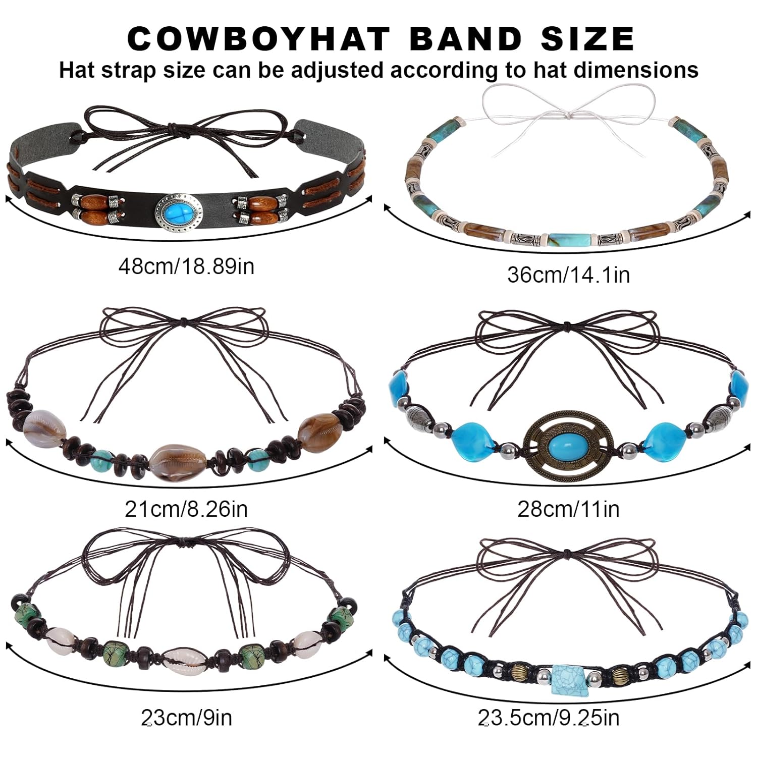 Various Style Designs: 6 Pcs cowboy hat band ethnic western hat belts, stylish to share with family or friends. The rope at the end of cowboy hat belt is easy to adjust to suit most western hats, cowboy hat, cowgirl hat, straw hat, caps