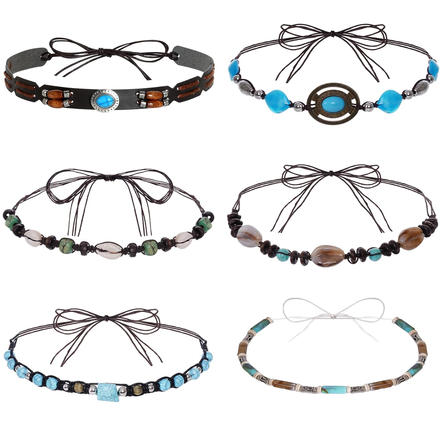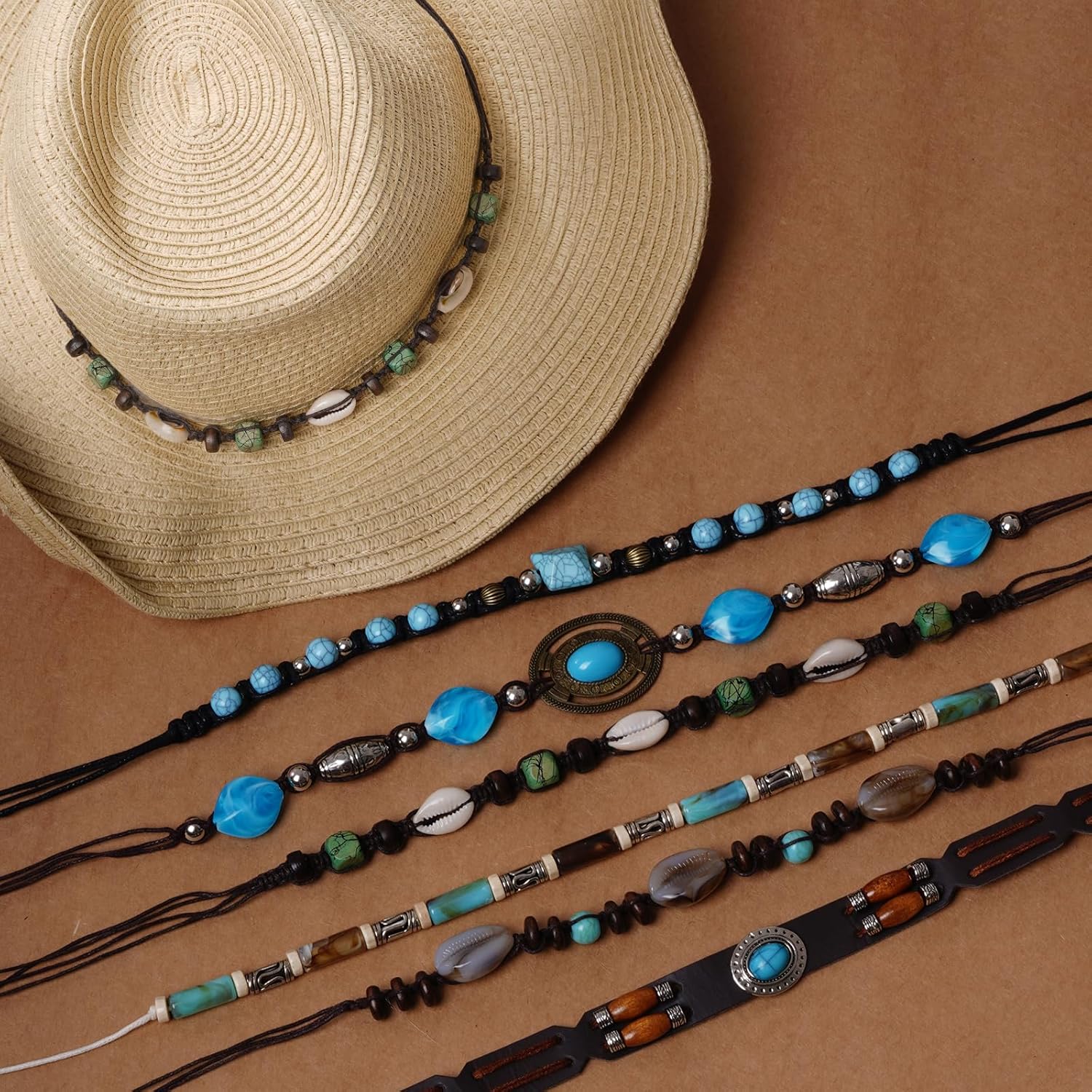6Pcs Cowboy Hat Bands Ethnic Western Hat Bands for Cowboy Hats Leather Cowgirl Turquoise Beaded Belts for Women Men