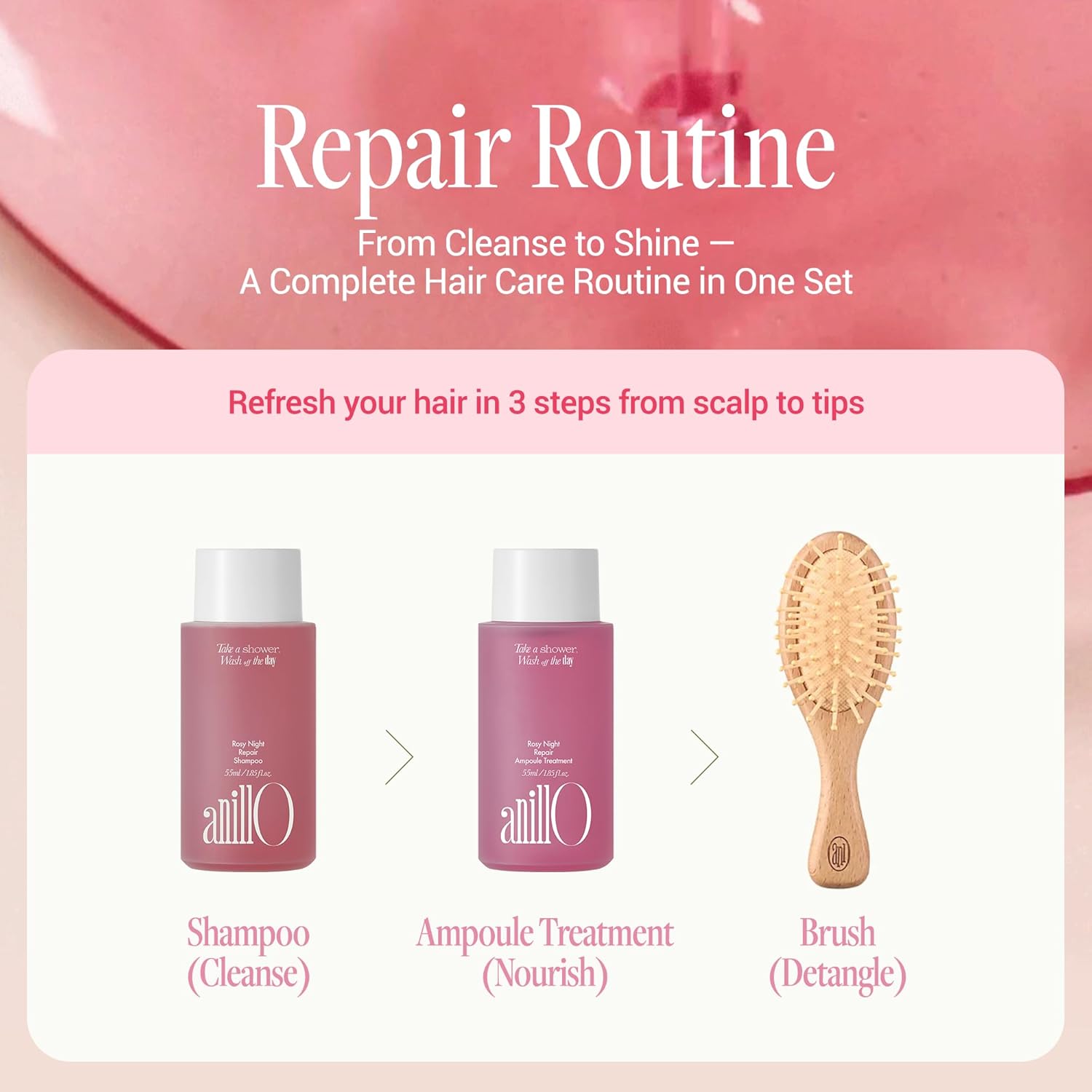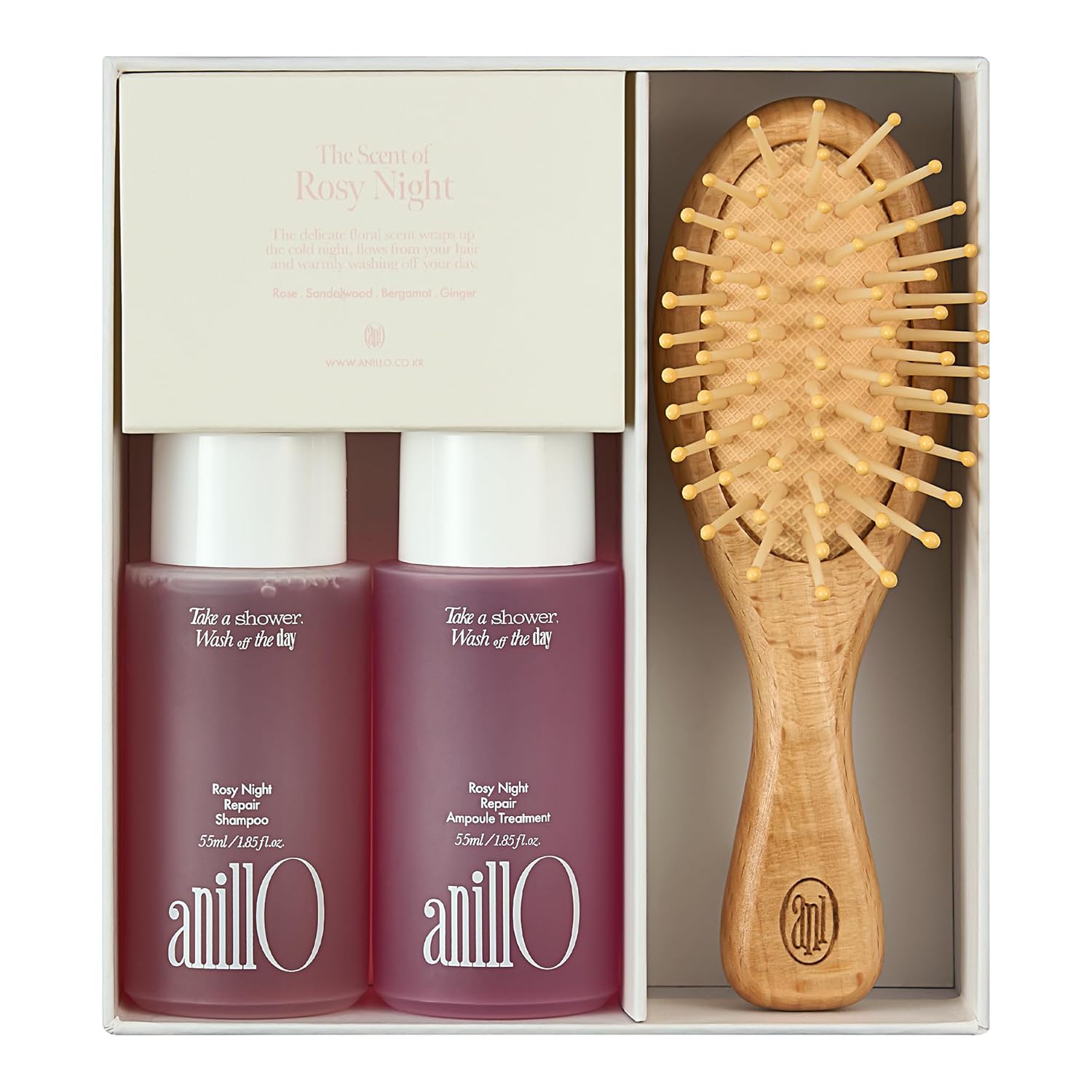 There are evenings when the simple act of washing your hair feels like a reset, a way to leave behind the day and step into calm. The anillO Rosy Night Repair Shampoo & Ampoule Treatment with Brush Set was created to turn those quiet moments into a beauty ritual. With a clarifying shampoo, a treatment ampoule serum conditioner mask, and a handcrafted wooden brush, this Korean hair care set delivers both elegance and care, blending performance with sensory indulgence.