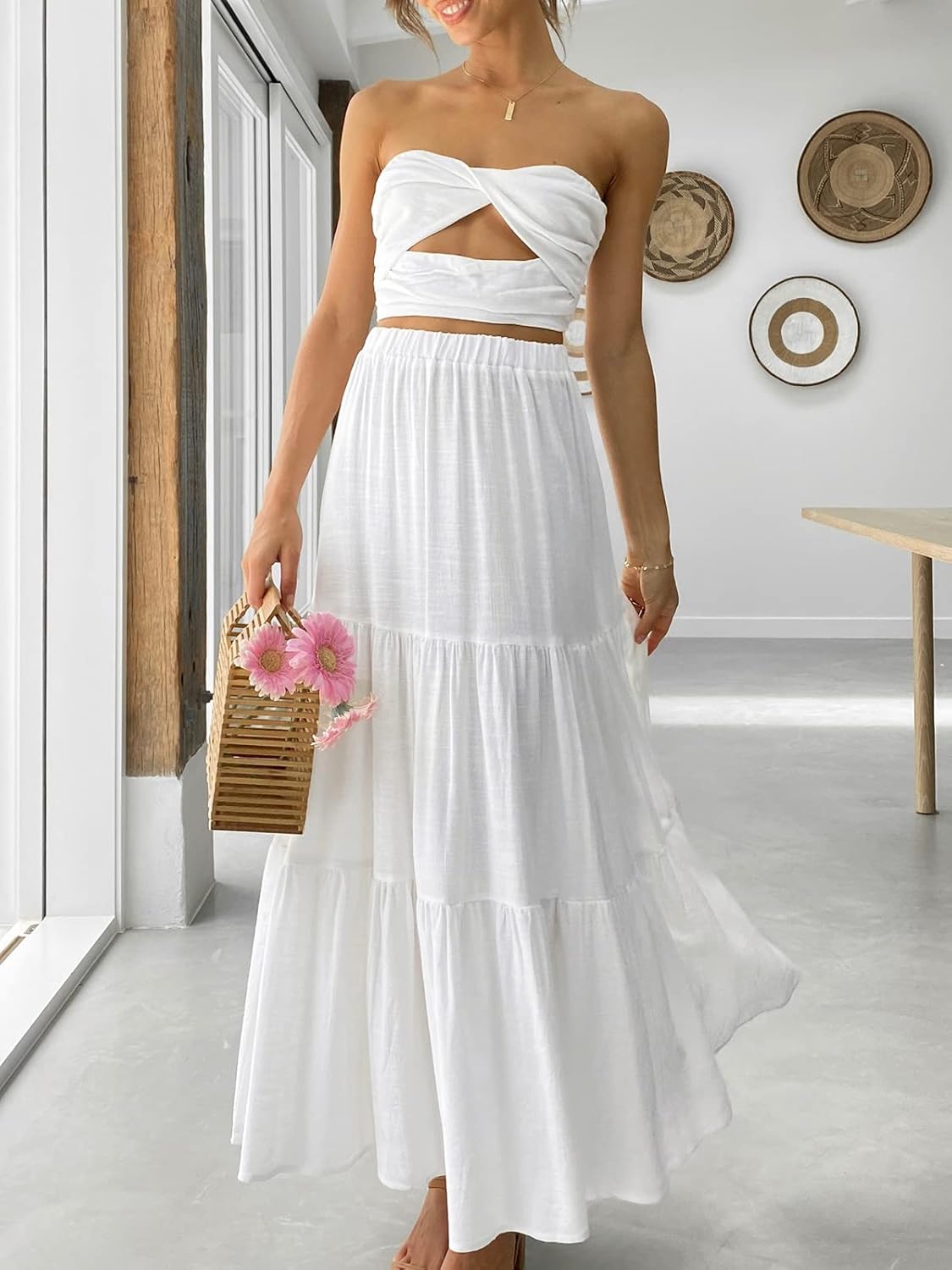 ANRABESS Women’s Summer Boho Flowy Swing Tiered A-Line Maxi Skirt 2026 Fashion Trendy Elastic Waist Pleated Long Beach Dress