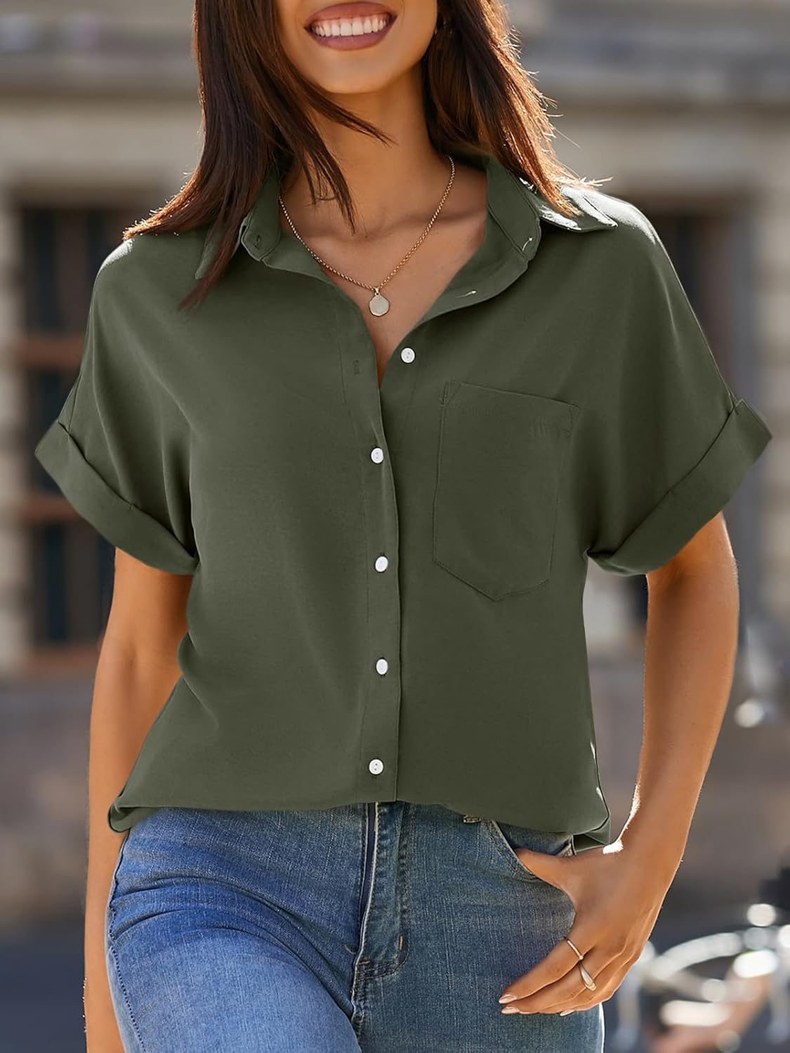 Womens Short Sleeve Casual Button Down Shirts Soft Fashion Blouses Tops