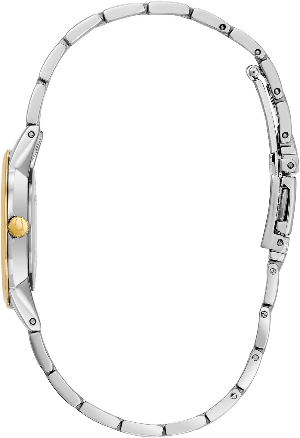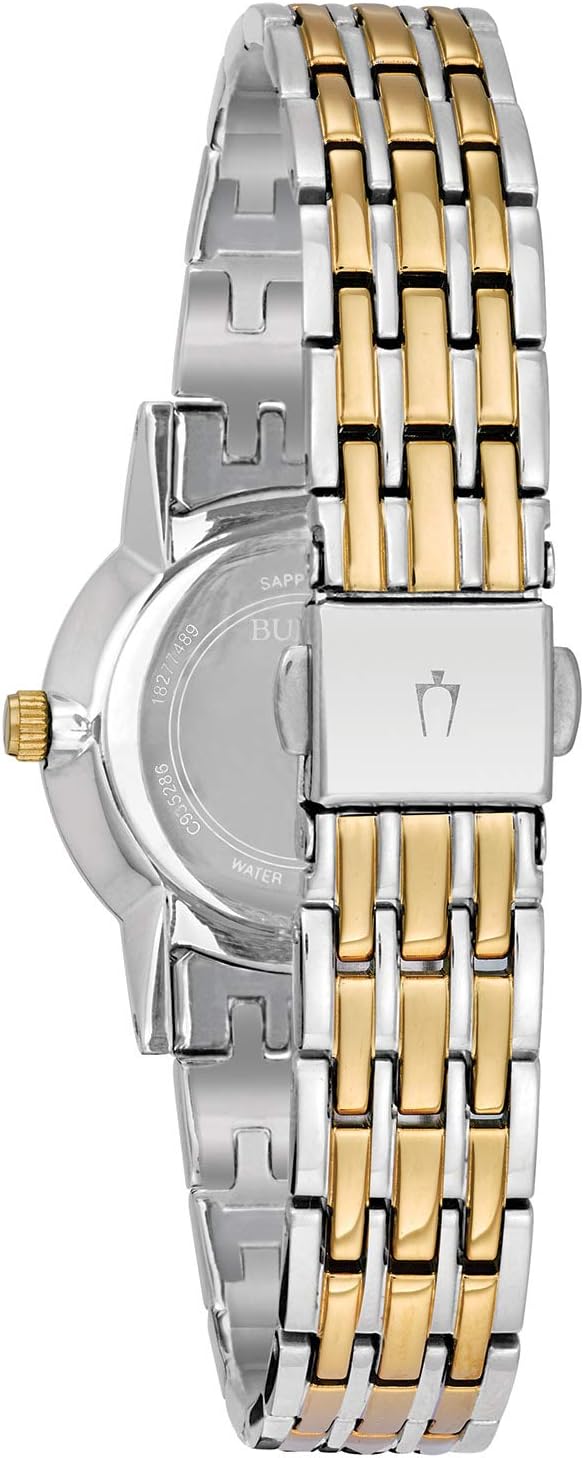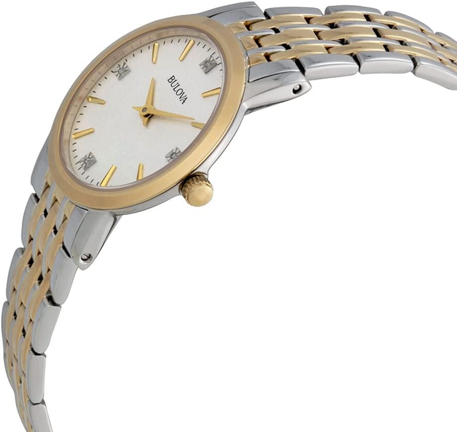 Model Number 98R288 Collection Ladies Classics- Diamonds Clasp Type Deployant Clasp with Push Buttons Dial Color White Dial Accent 4 Diamond Accents Case Material Stainless Steel Case Color Two-Tone Case Width 27mm Band Color Two-Tone Band Material Stainless Steel Crystal Material Mineral Crystal Water Resistance 30M Technology Quartz