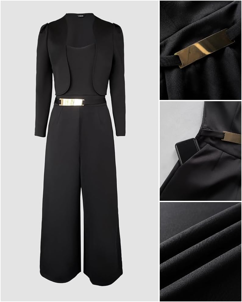 Be the first to review “CHICME Women’s 2 Pieces Outfits Thick Strap Waist Metal Decor Jumpsuit with Crop Coat Matching Set Casual Fall Outfits”