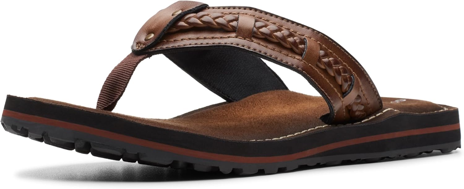 A carefree summer flip-flop with clarks collection aesthetics and comfort. made with honey synthetic straps with hardware accents, it pampers the foot with soft textile linings, a burnished eva footbed with cushion soft layers, and a tpr traction outsole. looks great with jeans, shorts or swimwear.