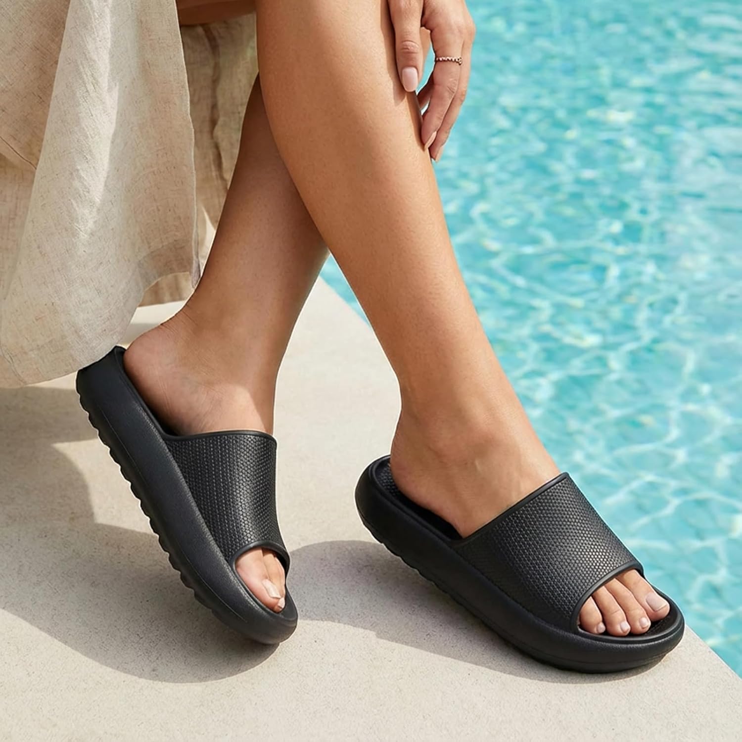 Cloud slides feature a concise style and a solid design, suitable for all seasons and occasions such as the bathroom, indoor bedroom, living room, swimming pool, outdoor beach, holidays, spas, leisure activities, public showers, steam rooms, etc. This makes our sandals for women 2025 the ideal choice for various settings.The supportive nature of the EVA material can offer compression resistance. The deep heel cup, along with the cushioned and rebound thick sole, can provide ultra cushioning. When you take a bath, our shower slippers can also protect you from falling due to their strong non-slip ability. Moreover, the quick-drying and breathable properties can offer a more comfortable life experience.