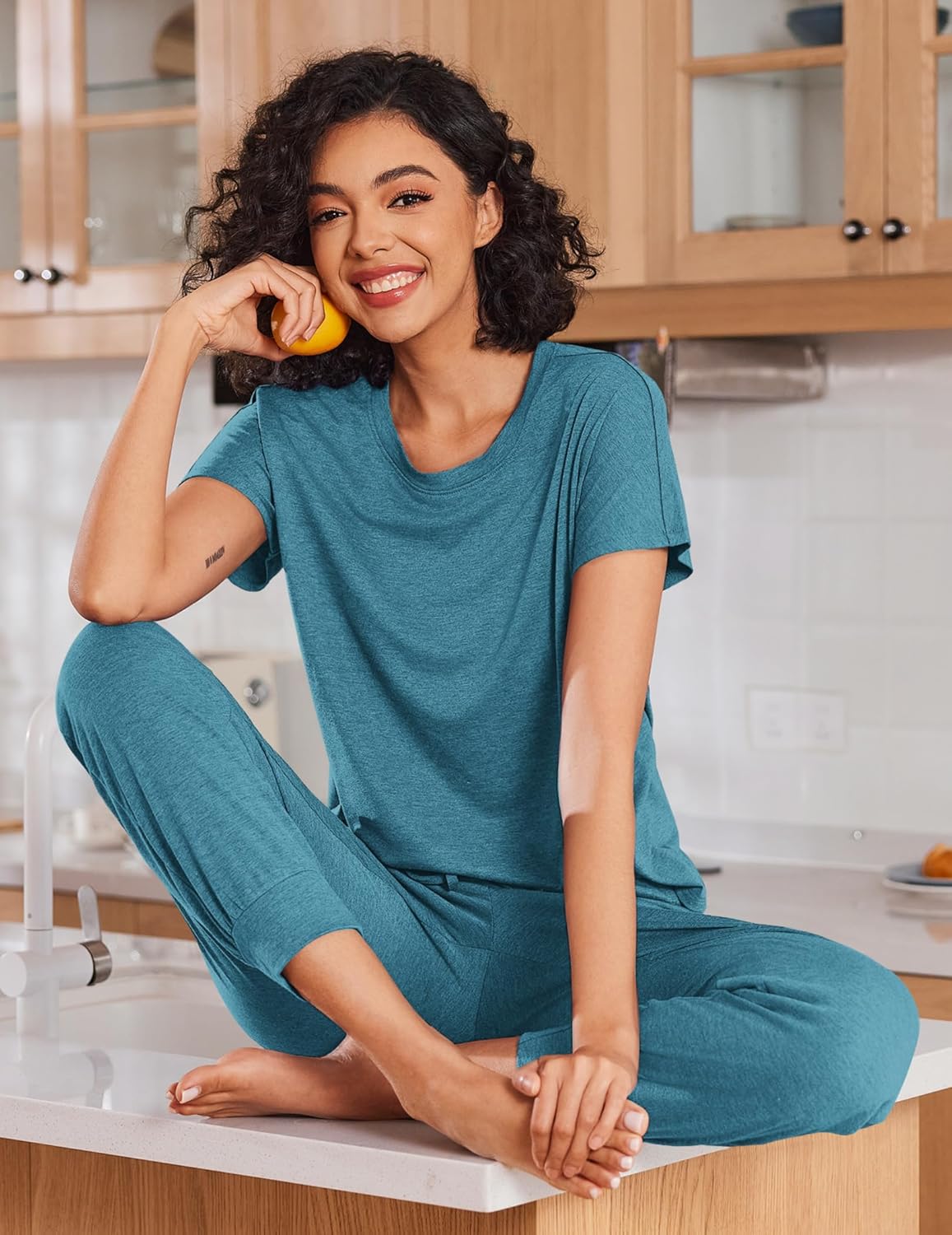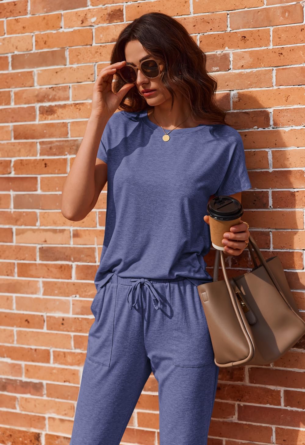 Ekouaer 2 Packs Women Pajama Sets-Short Sleeves Top and Jogger Pants