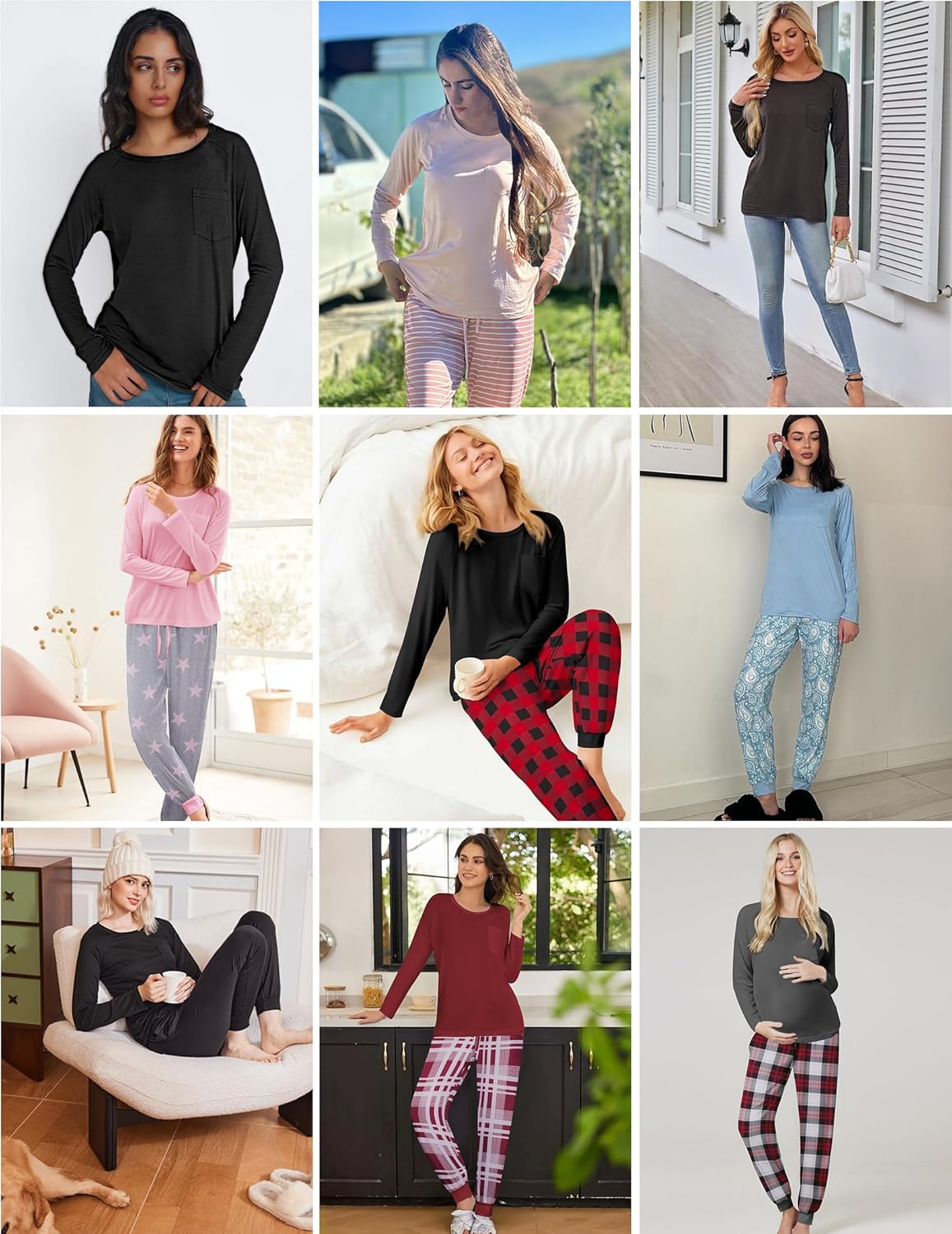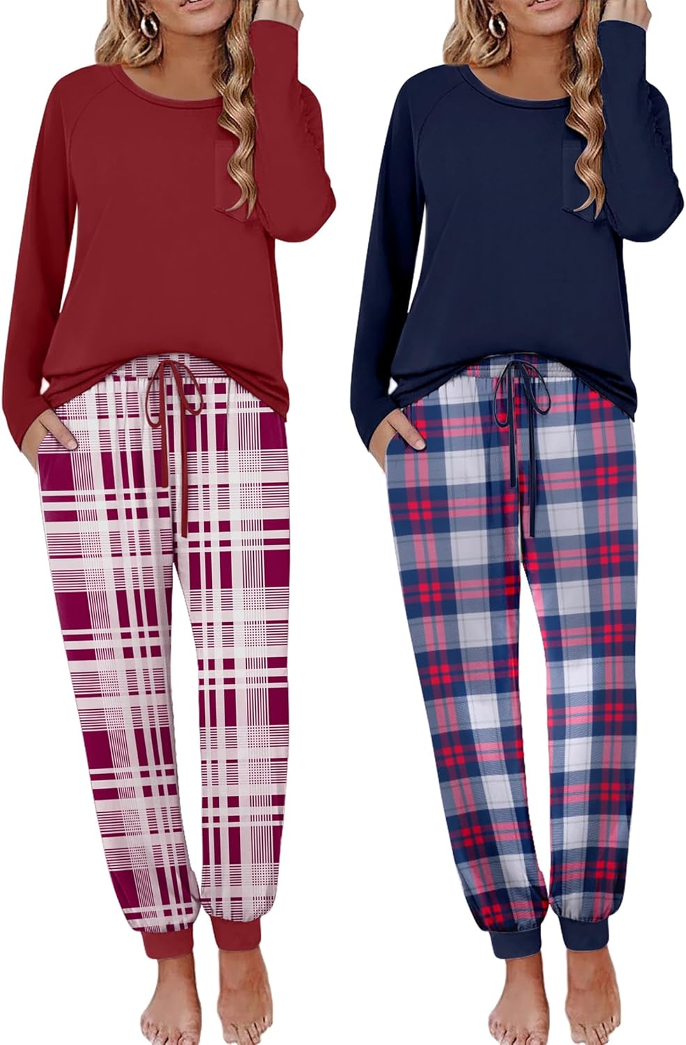 Ekouaer 2 pack pajamas set, featuring crew neck, long sleeve tops and elastic waist jogger pants with side pockets, multiply style for your choice.
