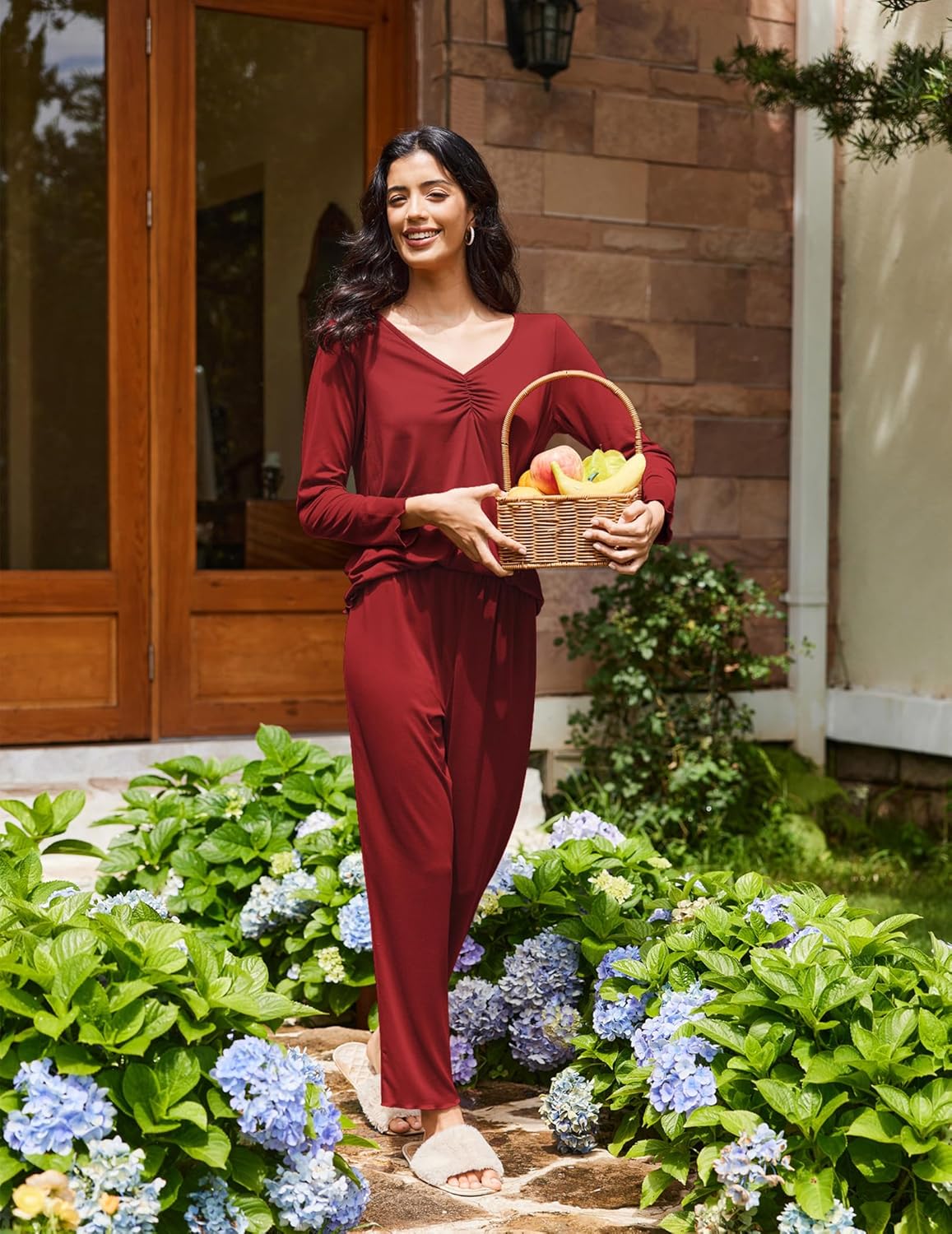 95% Polyester,5% Spandex,soft strechy and comfortable material. Long sleeve v-neck pleated top and full-length pants 2 piece pajamas set with Rolled edge design. To be casual fashionable in this fall and winter!