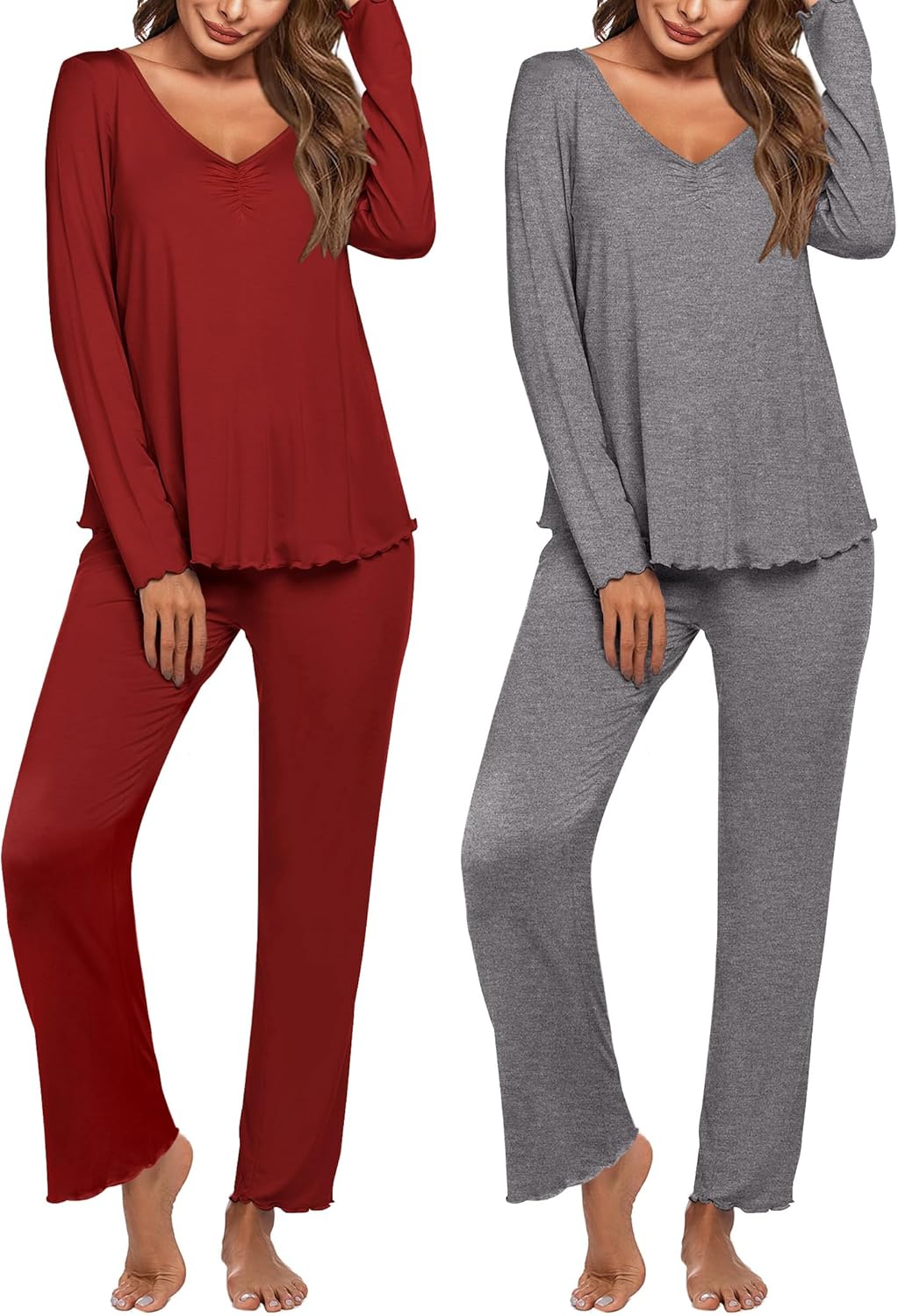95% Polyester,5% Spandex, super soft material. Long sleeve v-neck top and full-length pants 2 piece pajamas set, great for sleepwear and loungewear. Each package contains 2-pack pj sets, you can match it with multi-style.