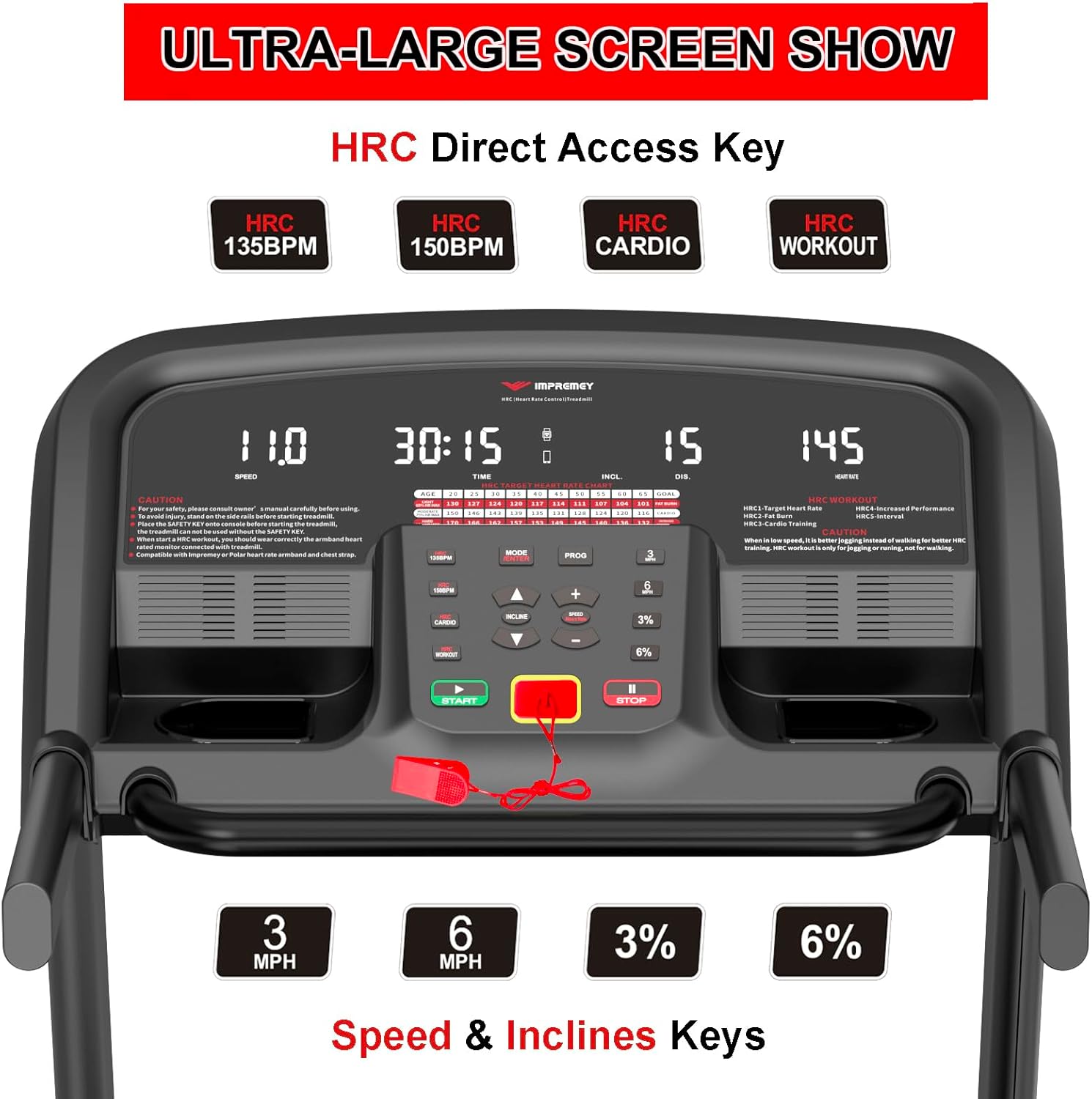 【Latest Innovative HRC Technolgy and Heart rate monitor armband included】Imptech HRC (Heart Rate Control) workout system helps you achieve the better running result by maintaining you in proper heart rate. It is smart to adjust speed automatically for optimized HRC workout that meets your goals (such as fat burn, cardio training, and increase performance training). And it is easy to operate HRC workout by direct access key without entering complicated user information.