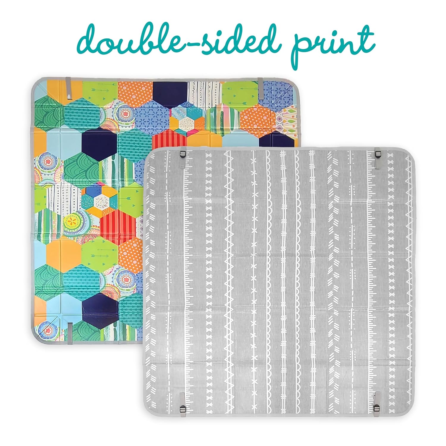 REVERSIBLE DESIGN FOR STYLE FLEXIBILITY: One side features bright colors to engage baby, the other is a neutral tone that blends into your home – perfect for shared spaces