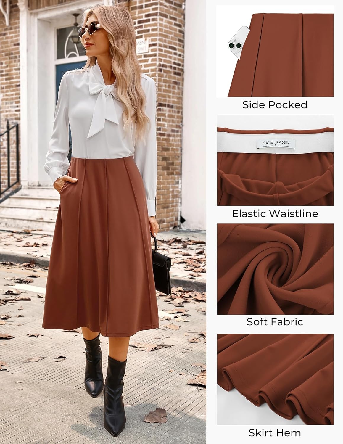 Kate Kasin Women’s High Waist Midi A-line Skirts with Side Pockets
