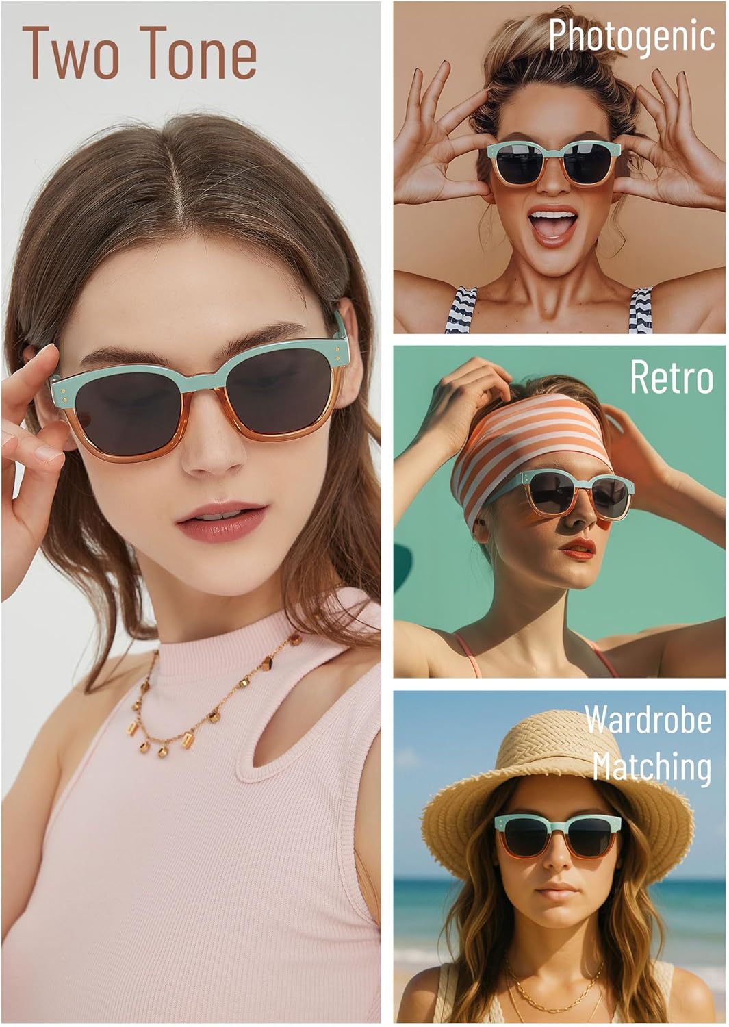One-of-a-kind solid yet subtle two tone sunglasses for women brings out the summer vibe with upper half bright colors yet matches your daily outfits with a low-key translucent amber lower frame. High fashion rivet hinge metal dots at frame corner represents the latest 2024 trends.