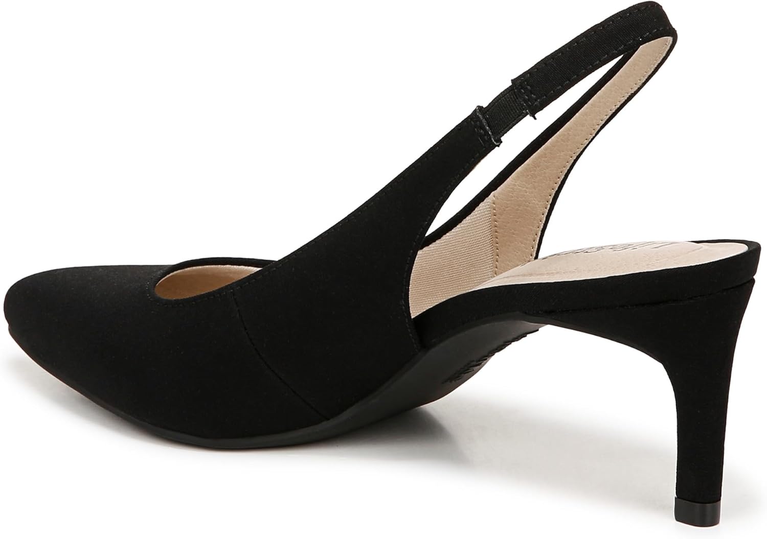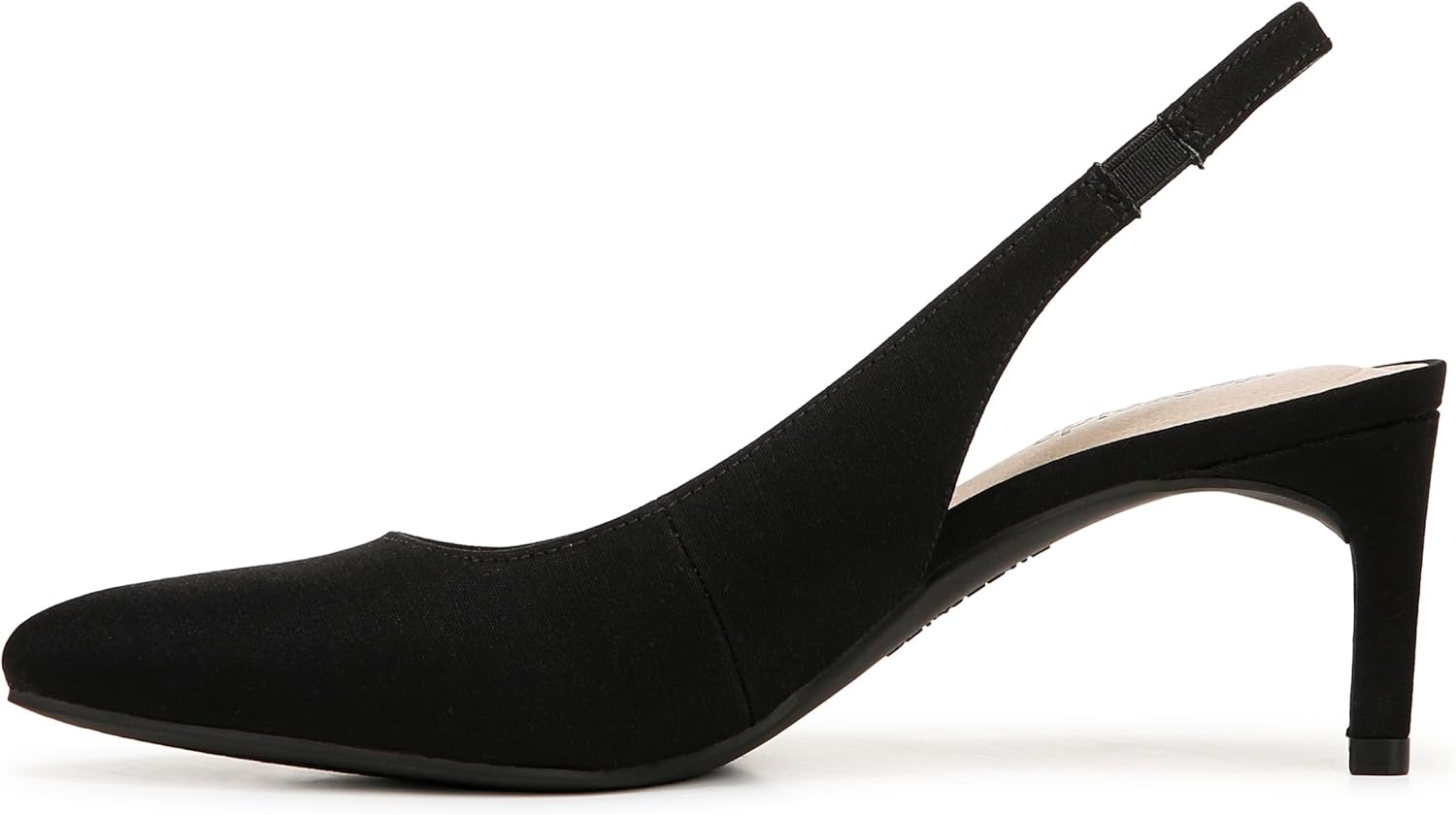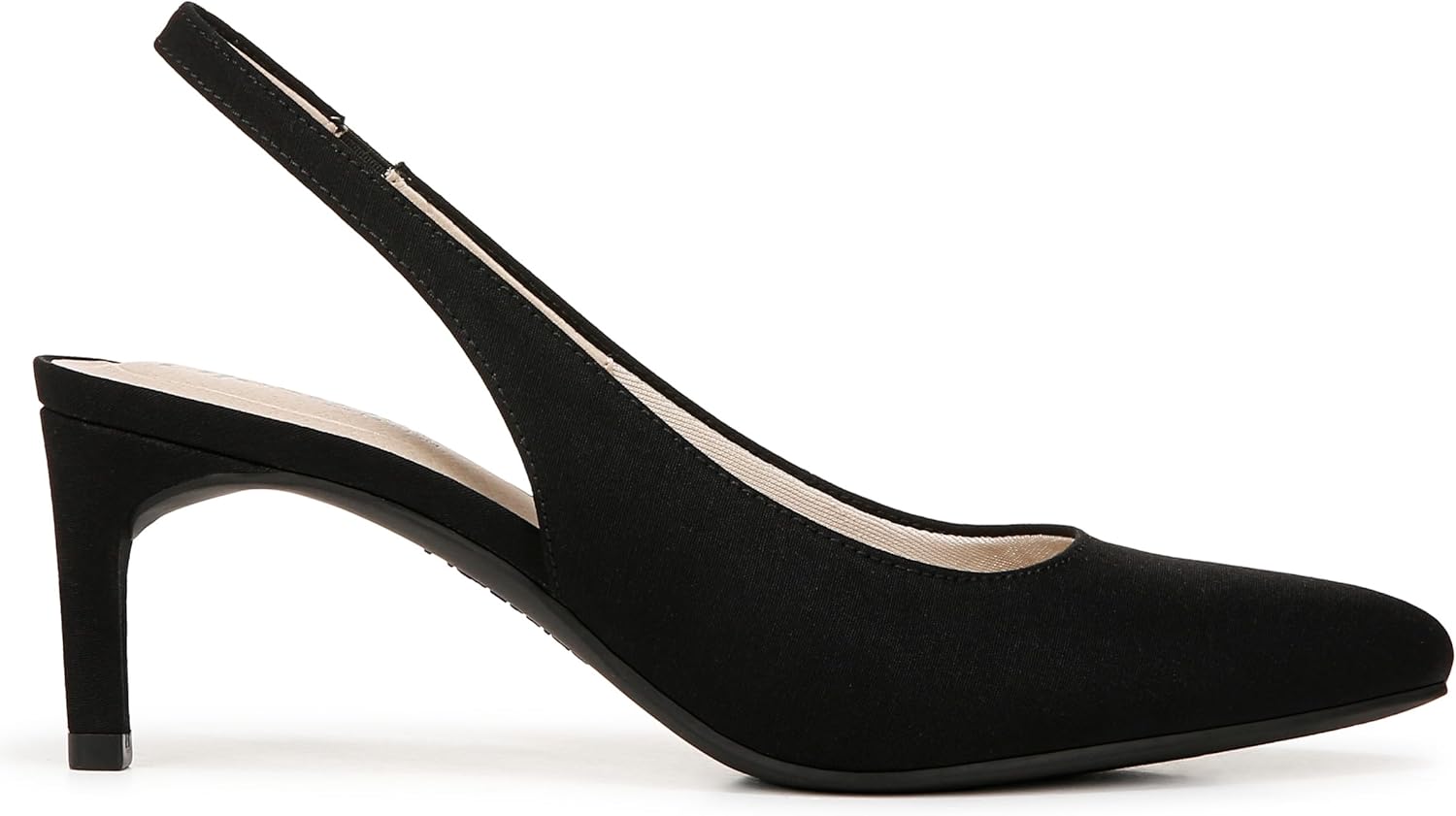 The classic slingback with a modern twist. Wear these comfortable women’s heels and take on your day with confidence. Faux leather or microfiber upper, softly pointed toe, and slingback strap with built-in stretch for the perfect fit. Linings crafted from partially recycled materials. Soft System® comfort package provides all-day support, flex, and cushioning. Traction sole for extra stability. Just Right Height 2 3/8 inch heel.