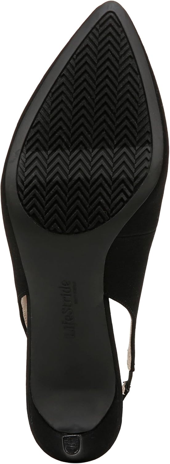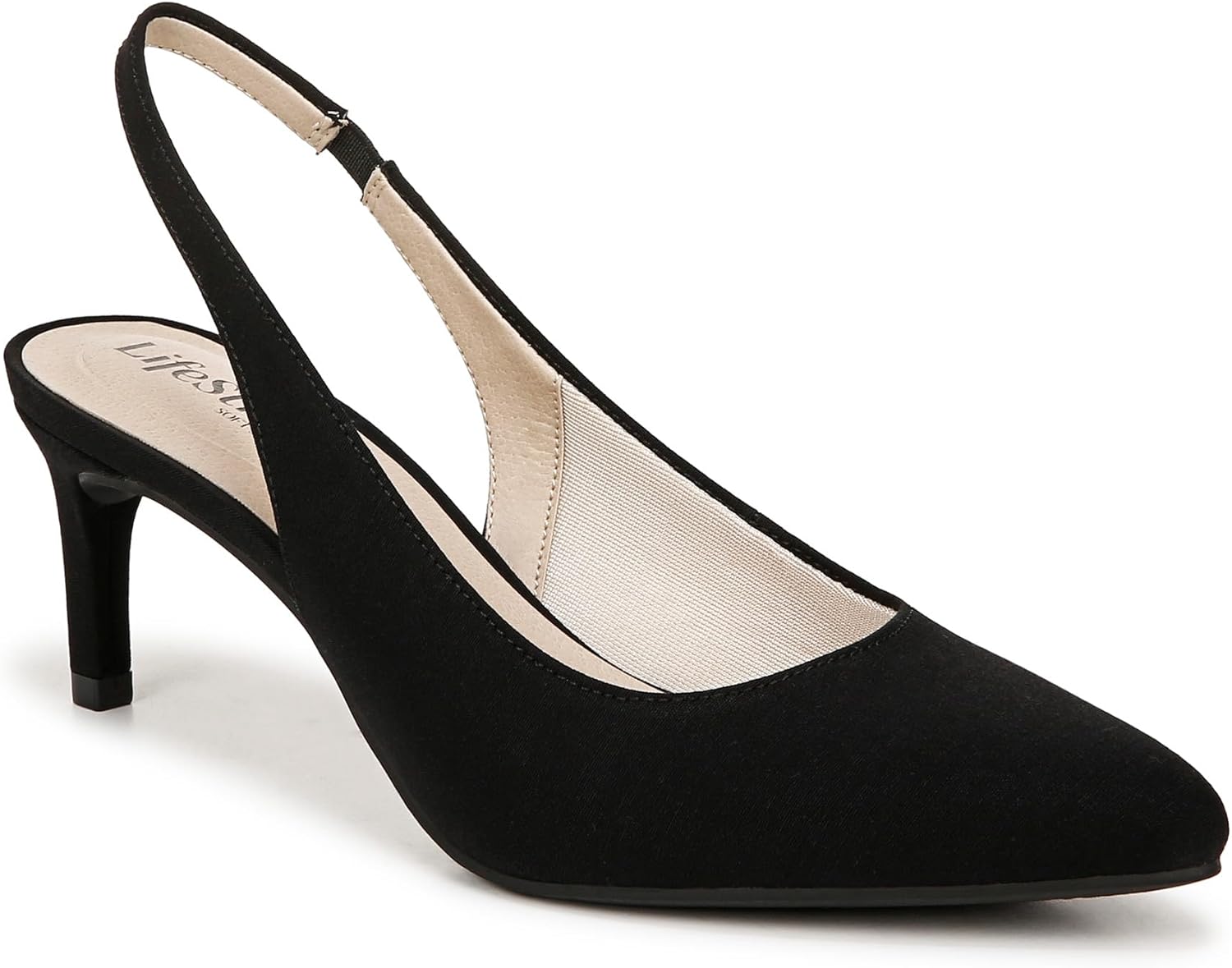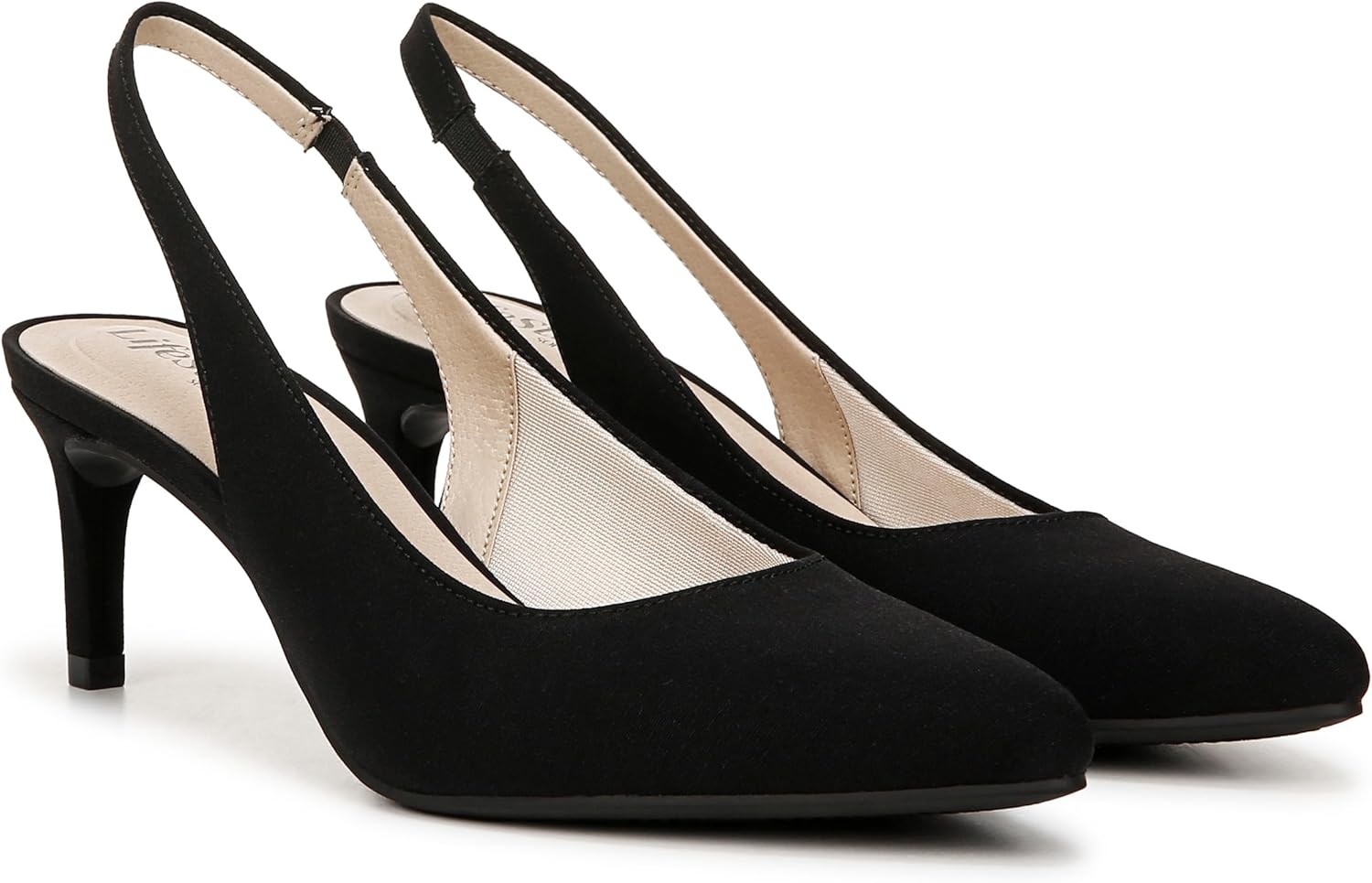 The classic slingback with a modern twist. Wear these comfortable women’s heels and take on your day with confidence. Faux leather or microfiber upper, softly pointed toe, and slingback strap with built-in stretch for the perfect fit. Linings crafted from partially recycled materials. Soft System® comfort package provides all-day support, flex, and cushioning. Traction sole for extra stability. Just Right Height 2 3/8 inch heel.