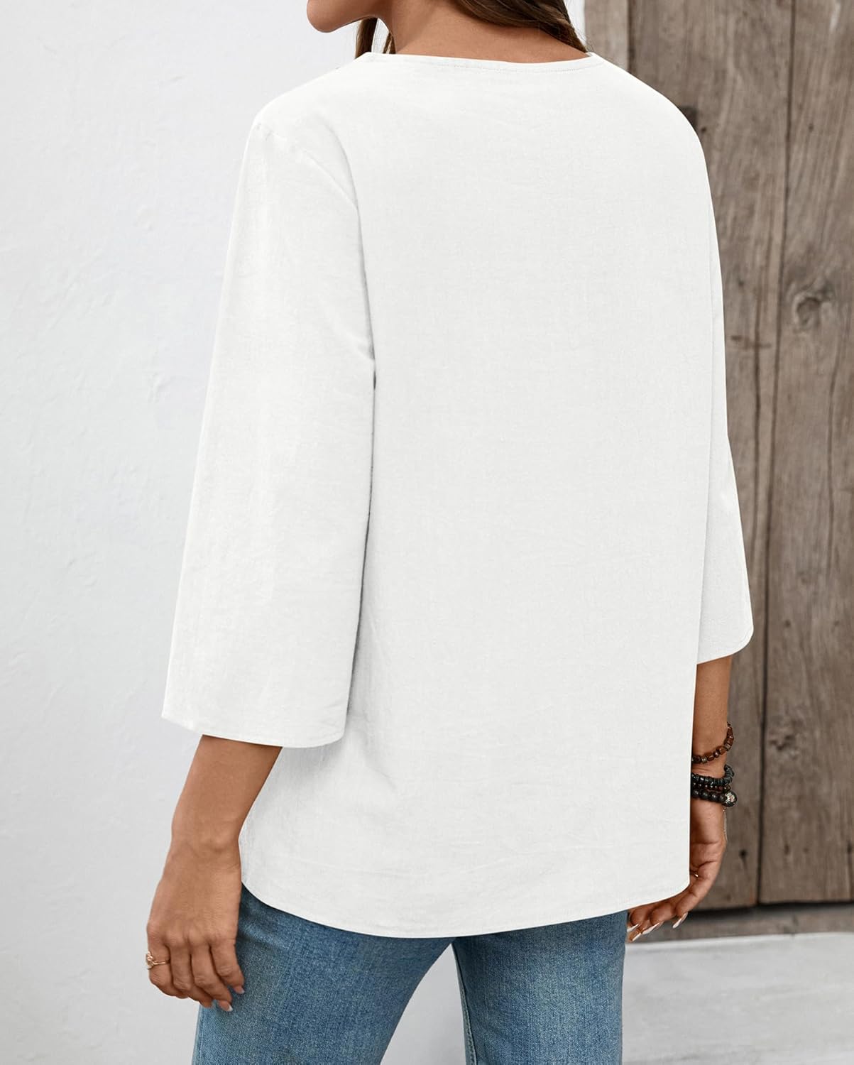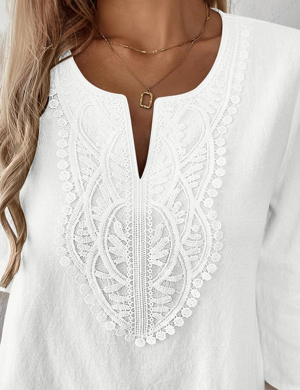 LOMON Womens 3/4 Sleeve Tops Cotton Linen Shirts V Neck Lace Casual Loose Fit Blouses Boho Fashion