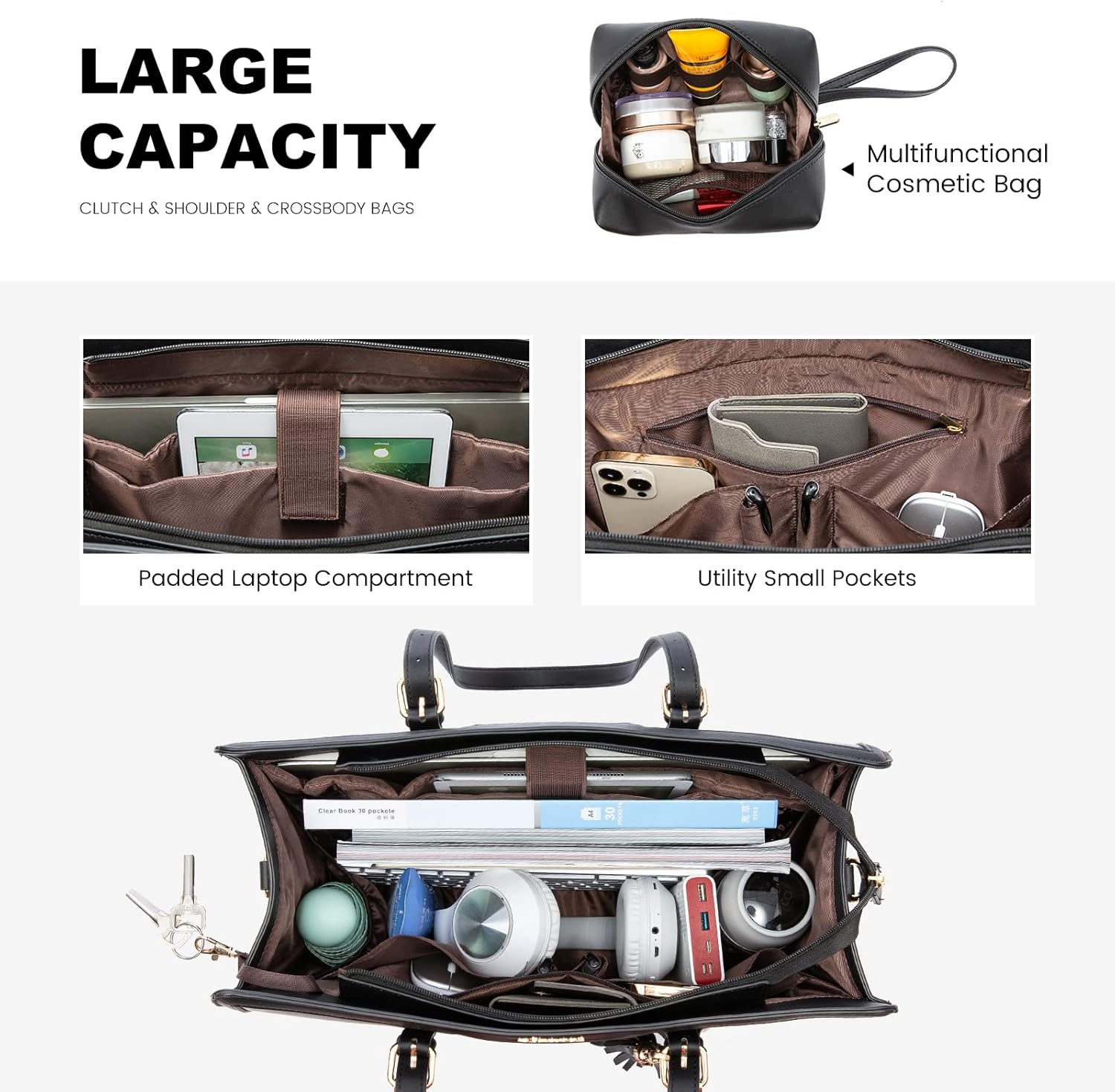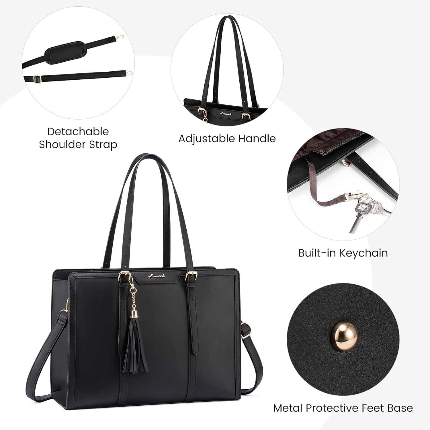 LOVEVOOK Laptop Bag for Women 15.6 inch Lightweight PU Laptop Tote Bag, Large Capacity Computer bag with Clutch Purse for Business, Work, Office, Travel, School,Casual(Black & Leather)