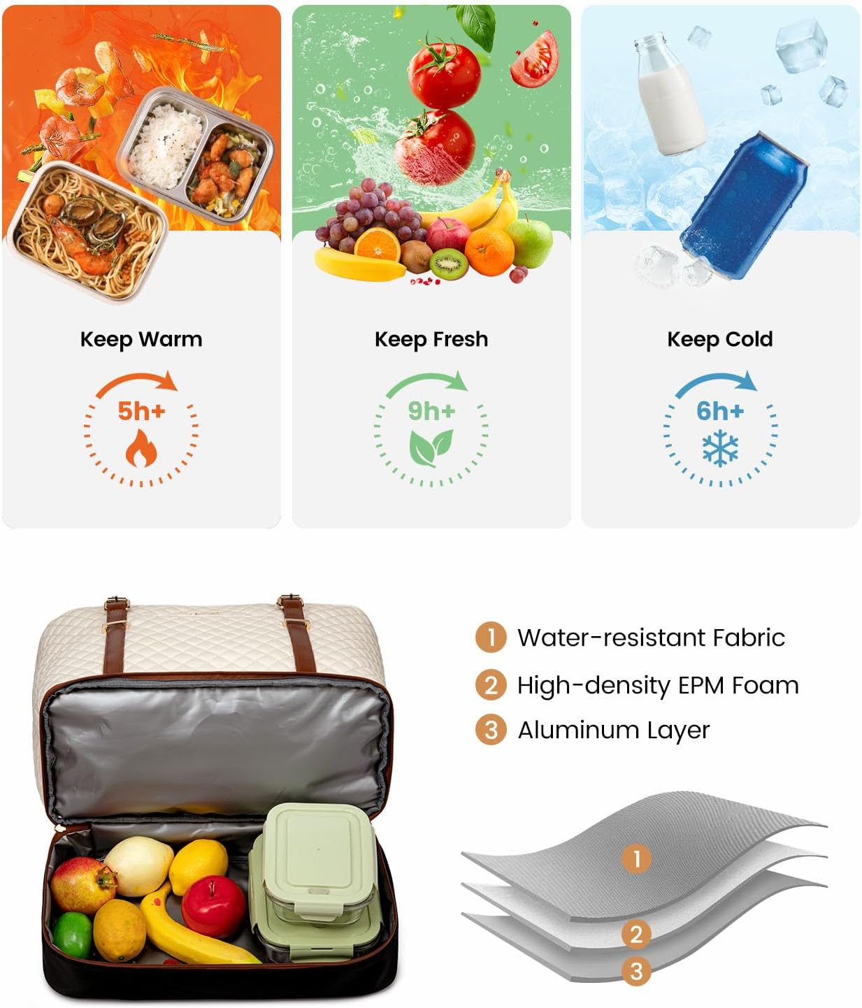 【Insulated Lunch Compartment】: Keep your meals fresh with the dedicated lunch compartment. Featuring water-resistant and dirt-proof fabric, the lunch tote bag for women easily maintains your foods warm 5h and drinks cold 6h.
