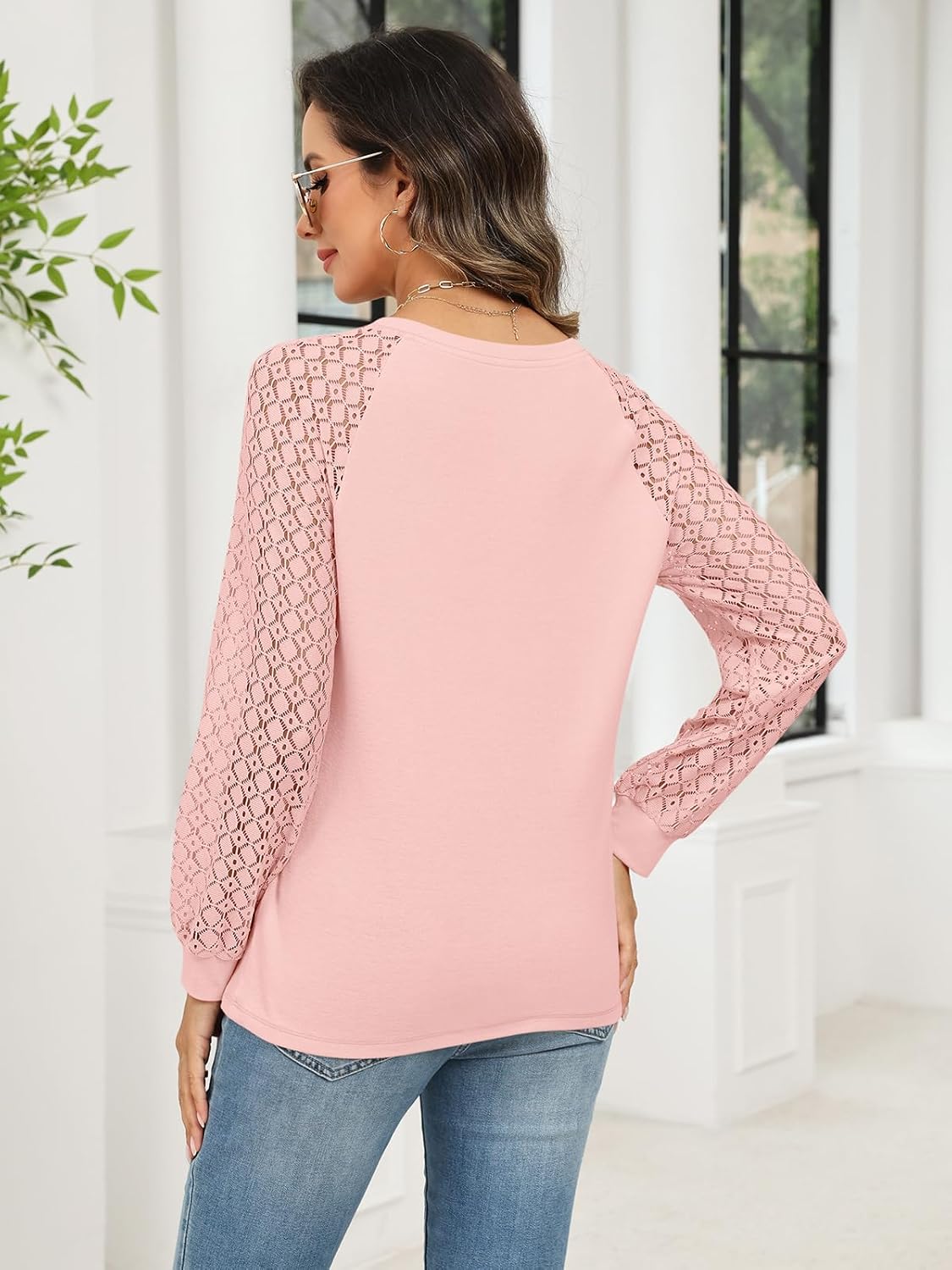 >Fabric: Polyester, Cotton and Spandex; Soft, stretchy, breathable and smooth fabric; It’s comfy to wear it all day.>Features: Lace Sleeve Tops, Henley Tops, Button Down Shirts, Long Sleeve Shirts, Women’s blouse. Long sleeve tops with lace design, provides a flattering and elegant look.