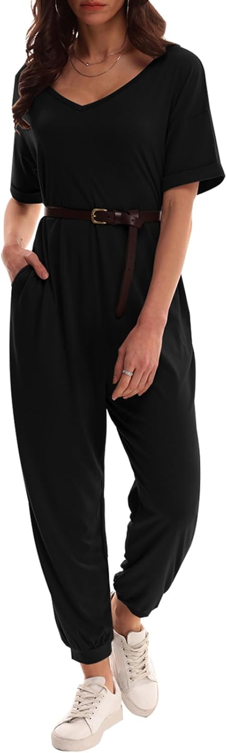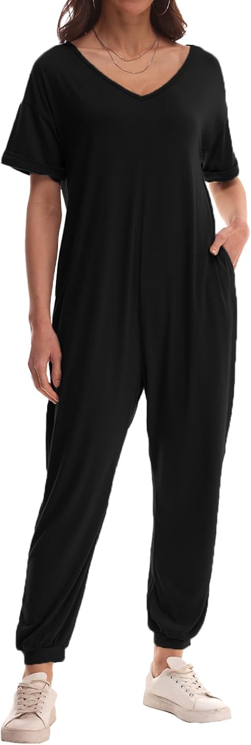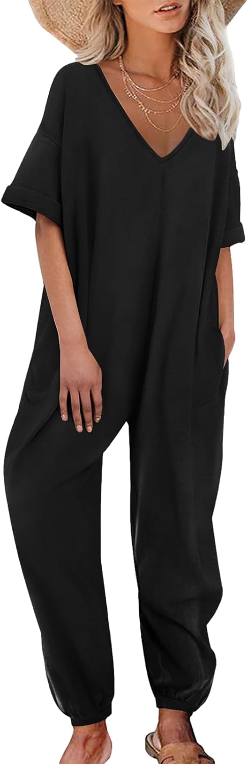 Feature: This jumpsuit features half sleeve, two side big pocketsv neck jumper, solid color, beam foot pants, baggy overall jumpsuit, loose fit style, long romper bodysuitThis stylish jumpsuits is made of cozy and lightweight fabric, relaxed fit