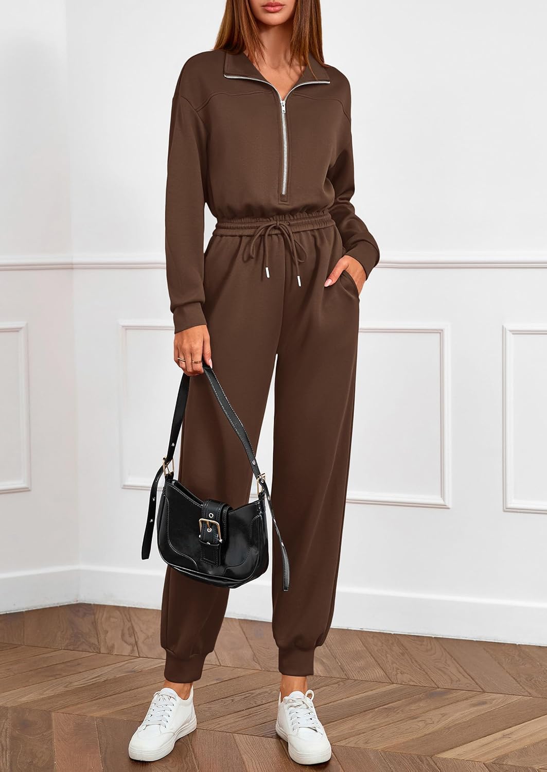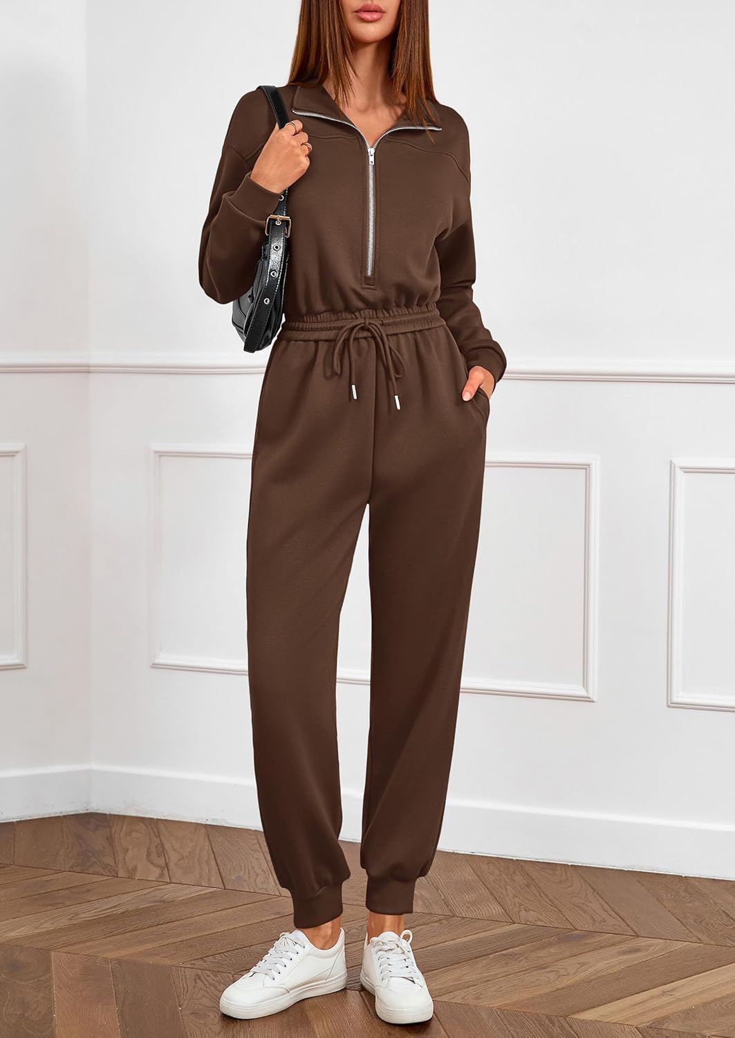 The half-zip front detail adds a sporty touch and makes this long sleeve jumpsuit easy to slip on and off.