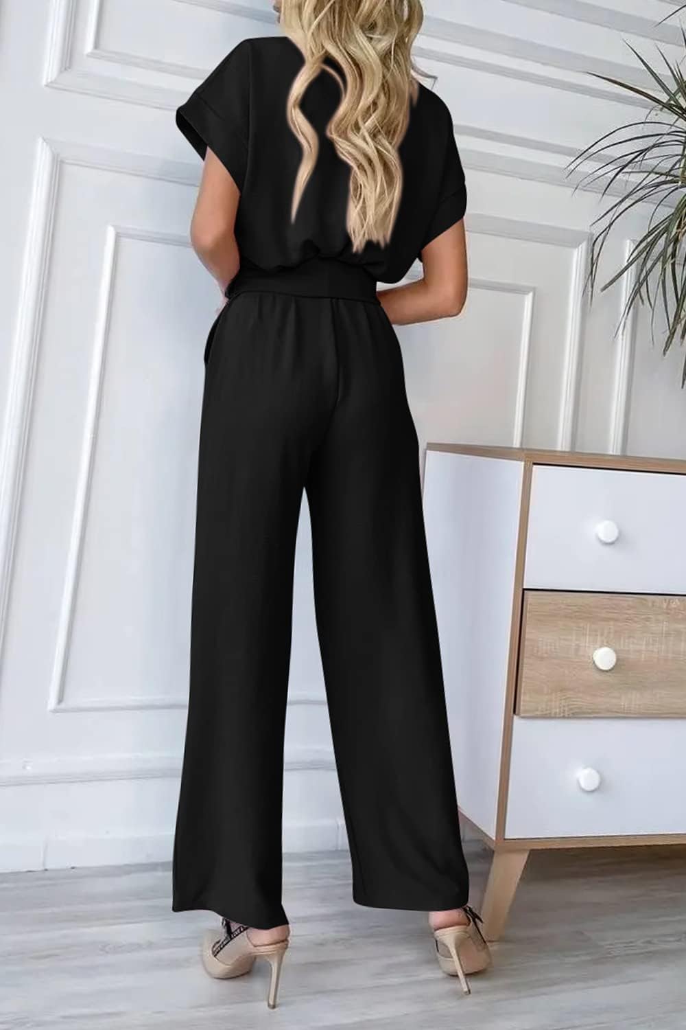 Fashion Style: Short Sleeve/V Neck/With Belt/With Pockets/Wide LegGarment Care: Machine wash or hand wash in cold water/Do not bleach/Hang to dry
