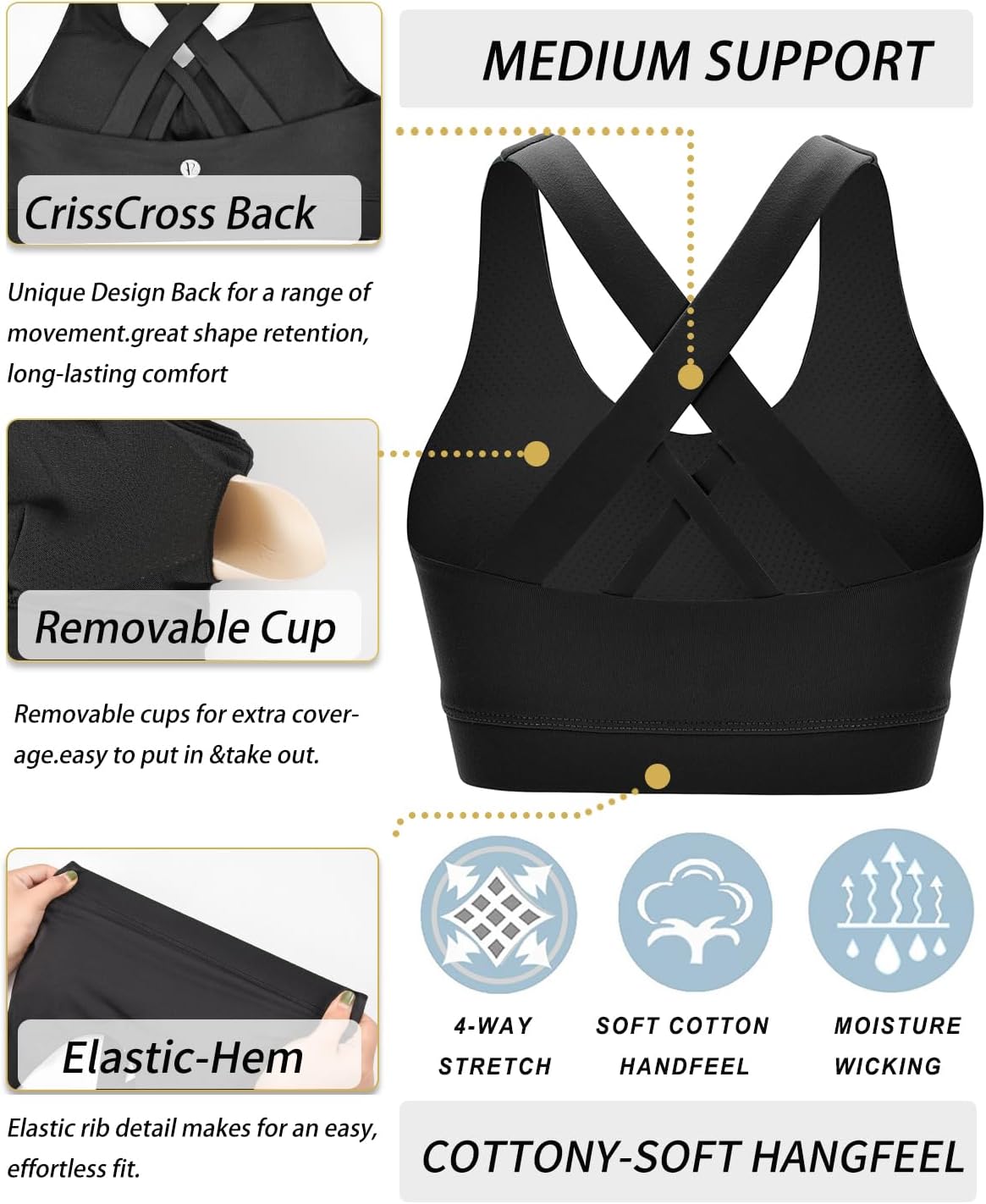 Designed for a compression fit, Maximum Support sports bras are constructed with thicker straps and wider hems. They are created for stability & comfort. Perfect for medium/ high-impact workouts such as tennis、HIIT training、yoga、running and cardio,fit snugly to the body for additional lift and support. They will hold you in without holding you back.They are our most supportive bras!