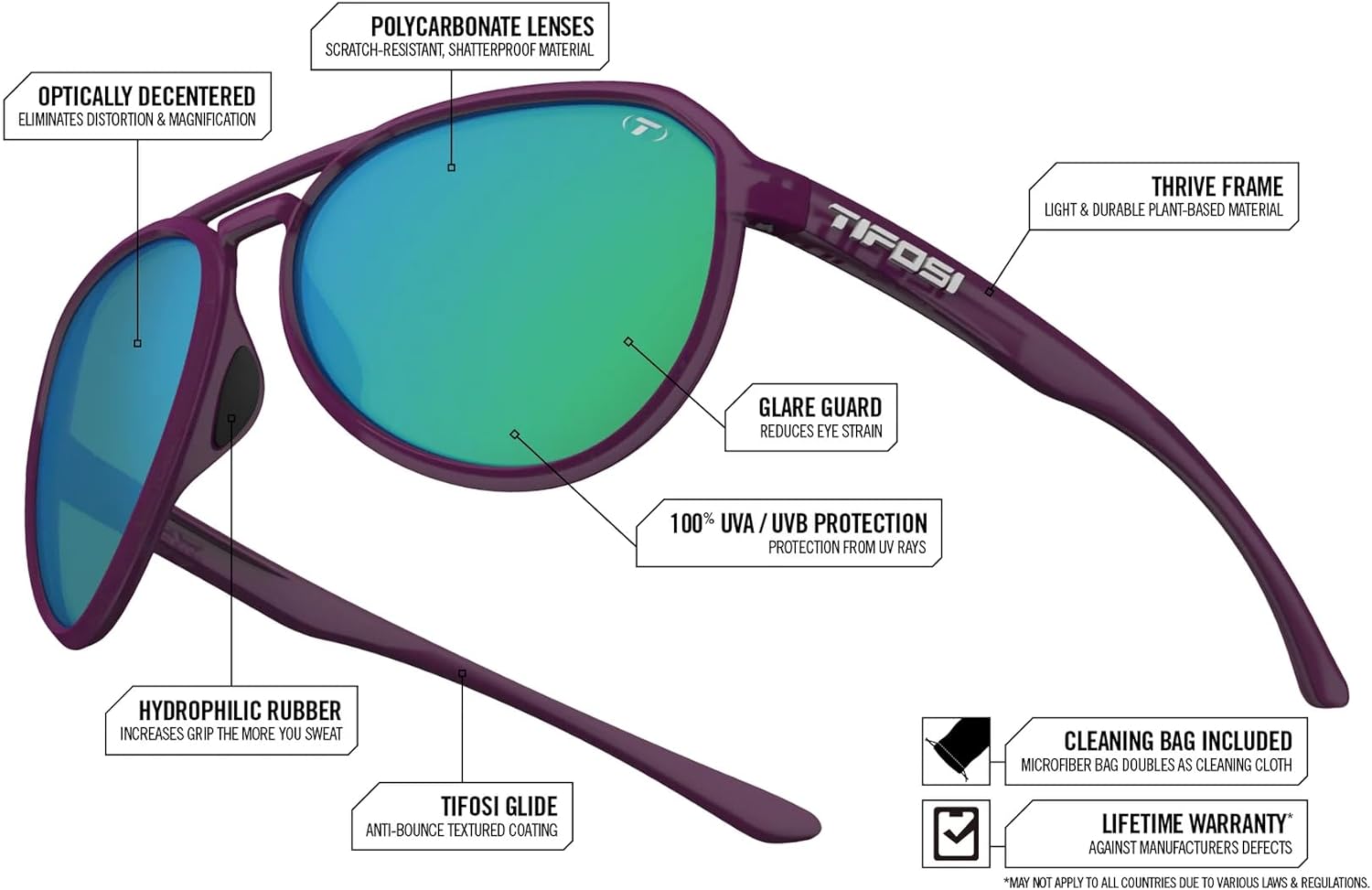 LENS TECHNOLOGY: Shatterproof polycarbonate lenses with UVA / UVB protection from harmful UV RaysULTRA LIGHT FRAME: Light only 22 grams, THRIVE frame which is a lightweight and durable plant-based material. Features integrated hinge which never pulls hair, hydrophilic nose pads for increased gripping. Tifosi Glide technology allows the frame to slide on comfortably and provide a no-slip fitIDEAL FOR: Golf, Hiking, Running, Tennis & Pickleball, LifestyleFIT: Medium – LargeINCLUDED: Microfiber cleaning bag