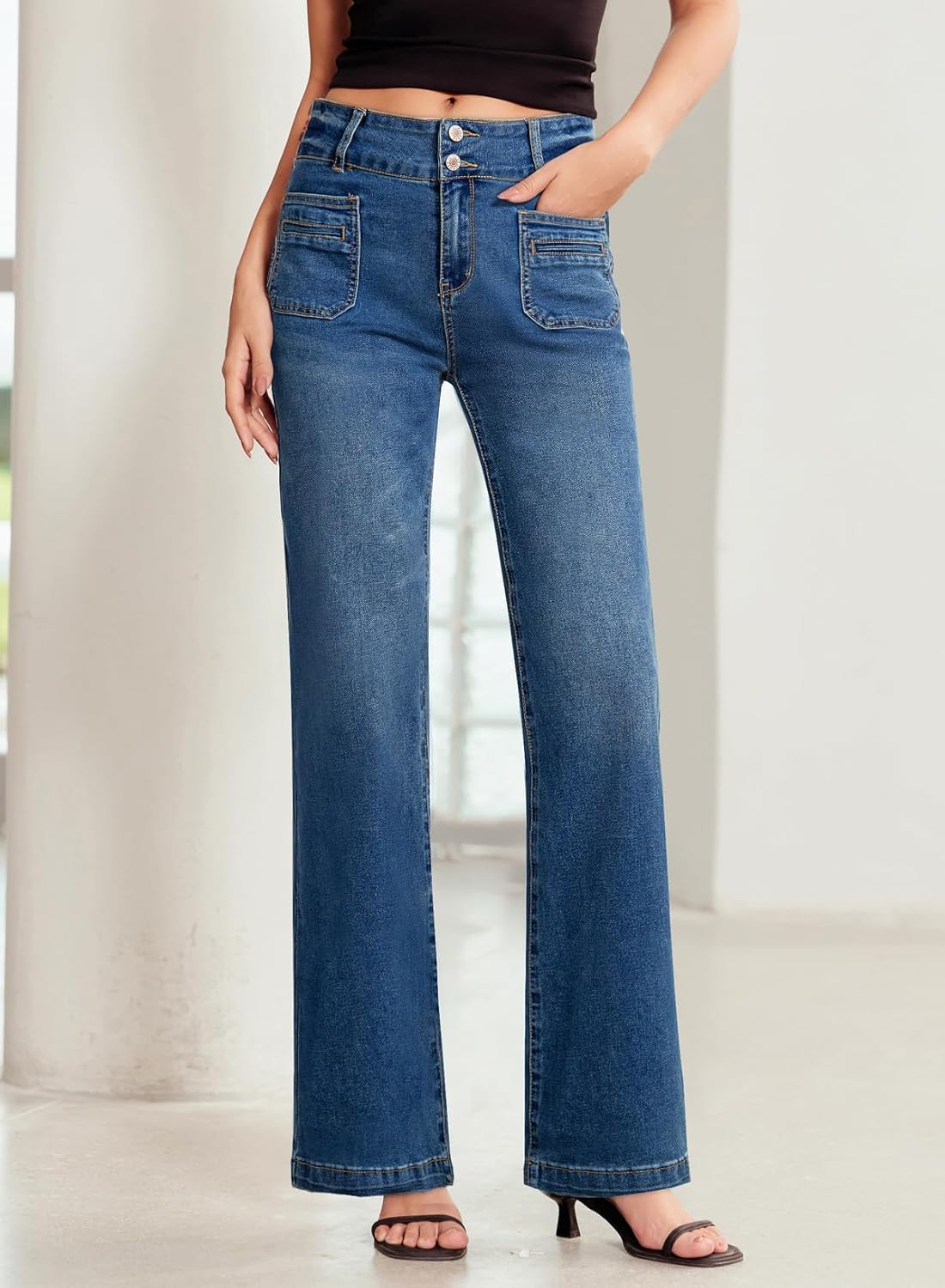 Sidefeel Women’s Wide Leg Jeans High Waisted Tummy Control Stretchy Pockets Front Straight Leg Jeans
