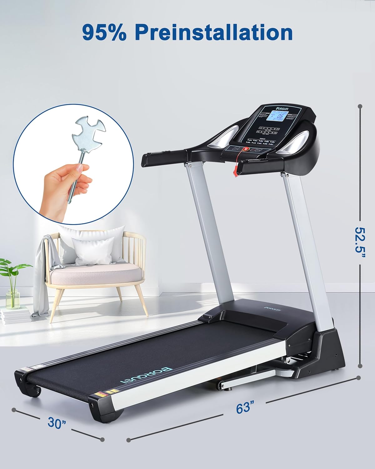 【20″ Wide Anti-Slip Shock-Absorbing Deck】BORGUSI upgrade 50″ x 20″ large running track to fit different users’ strides. The multi-layer treadmill belt was designed to cushion your footfalls with each step, further reducing unwanted noise. Our treadmill is designed to accommodate users of most body types with a weight capacity of 350 lbs.