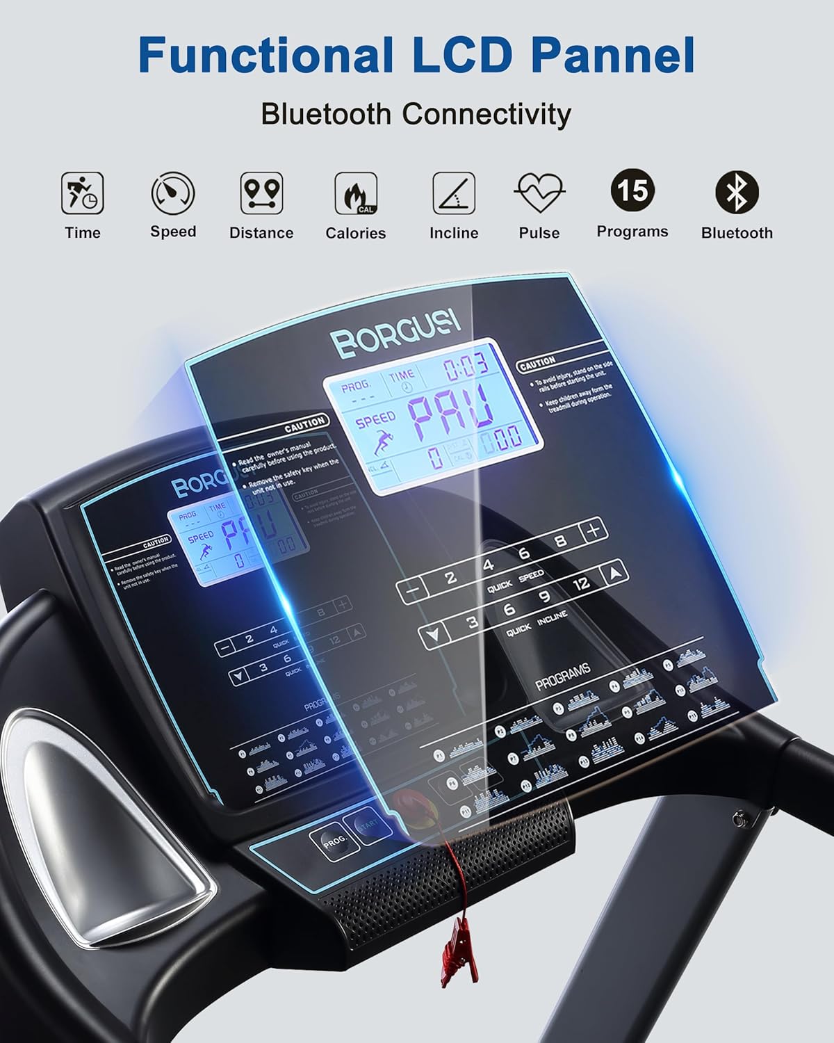【Intuitive LCD Panel with Bluetooth Speaker】7-Inch Large LCD display shows Time, Speed, Distance, Calories, Incline, and Pulse. P1-P15 preset programs personalize your workout for specific goals. Features the integrated Bluetooth speaker, you can sync your favorite music wirelessly while you are exercising.
