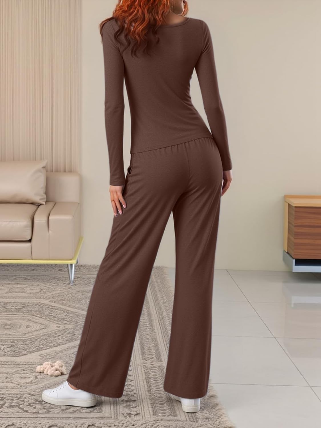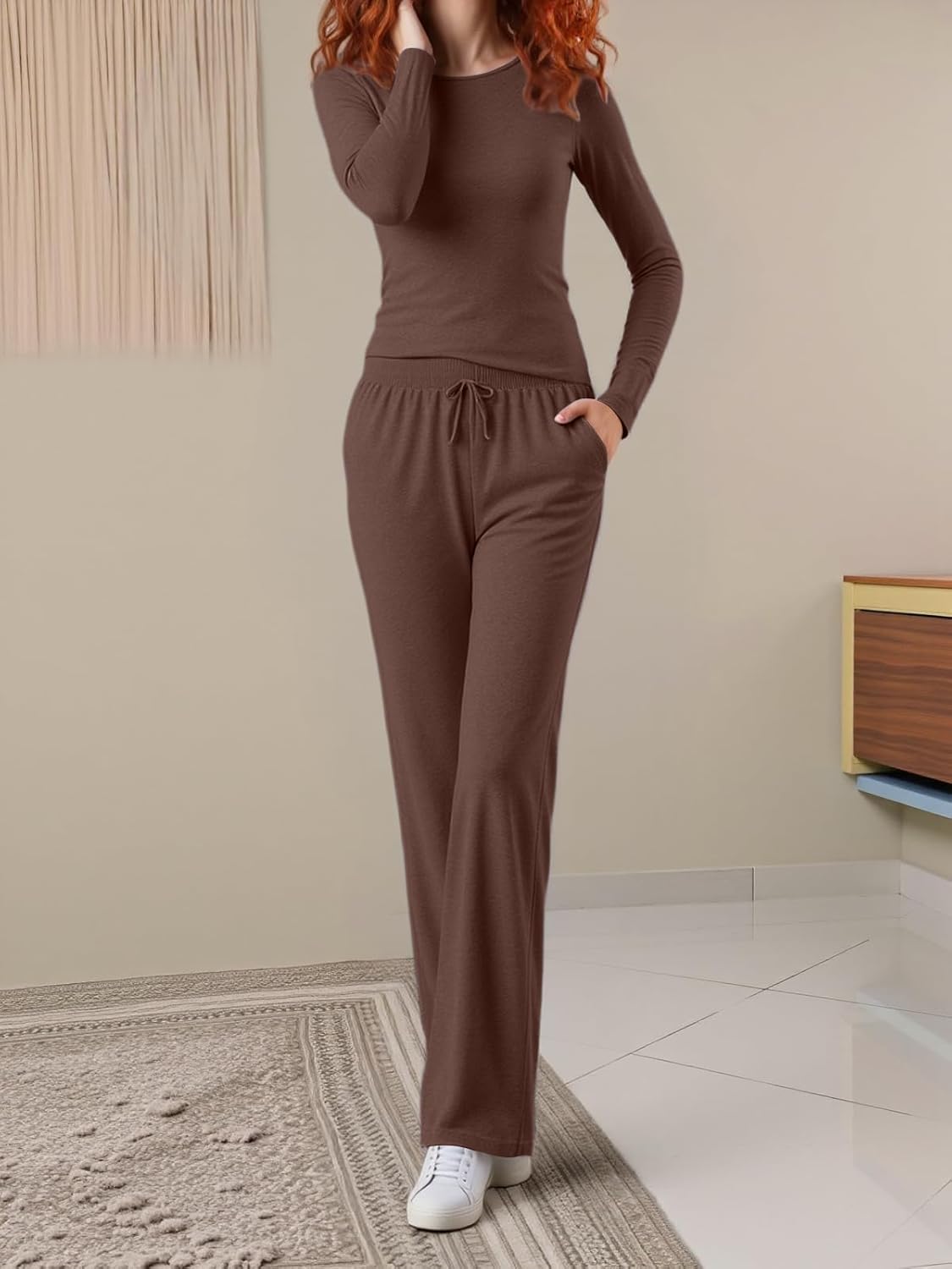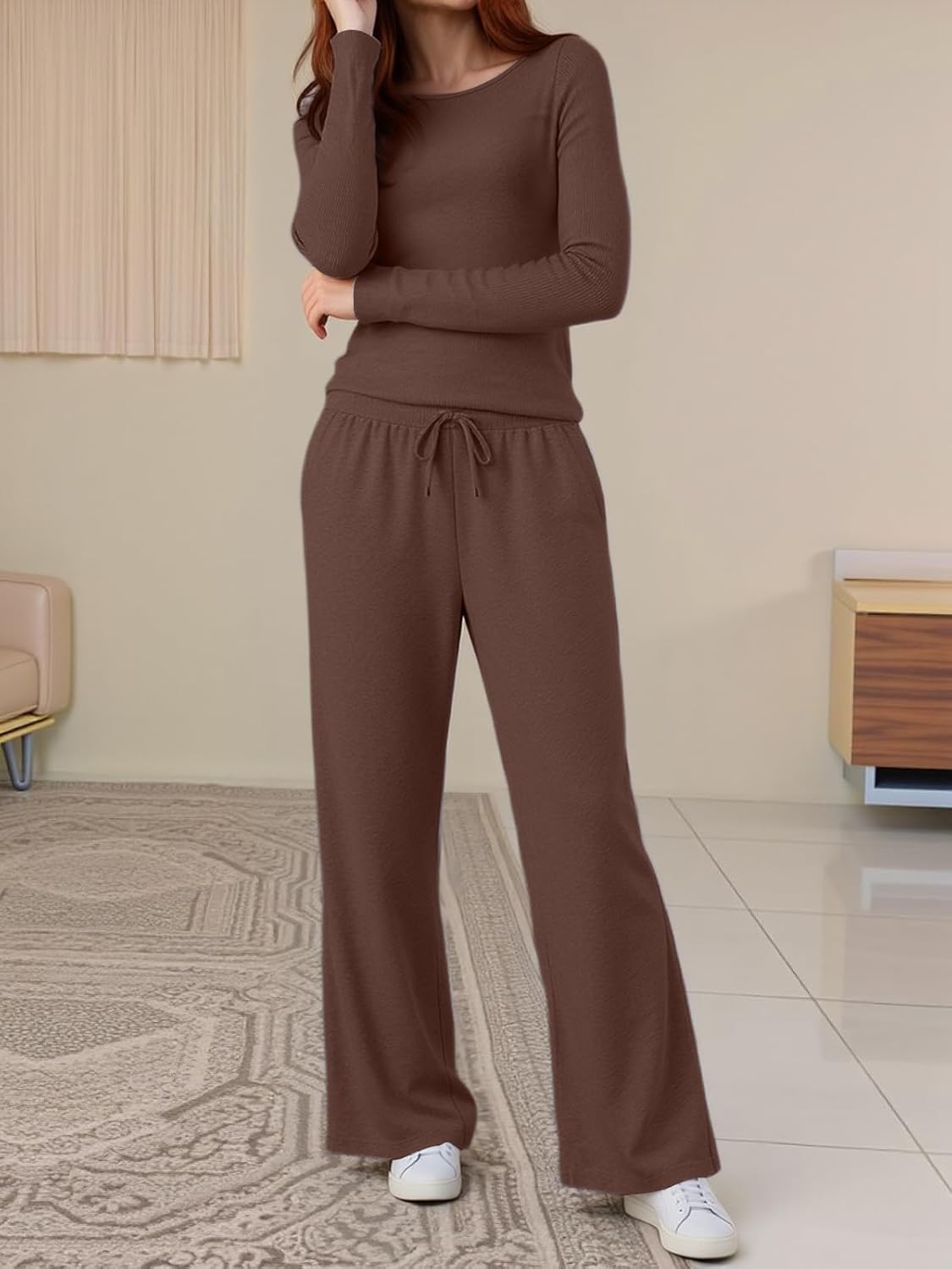 Women’s Long Sleeve Top and Drawstring Wide Leg Pants Pajama Set, Comfortable and Stylish Homewear with Pockets