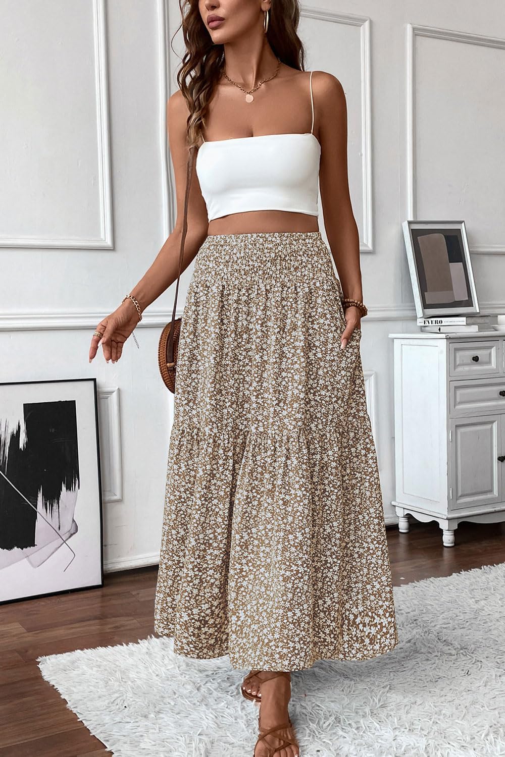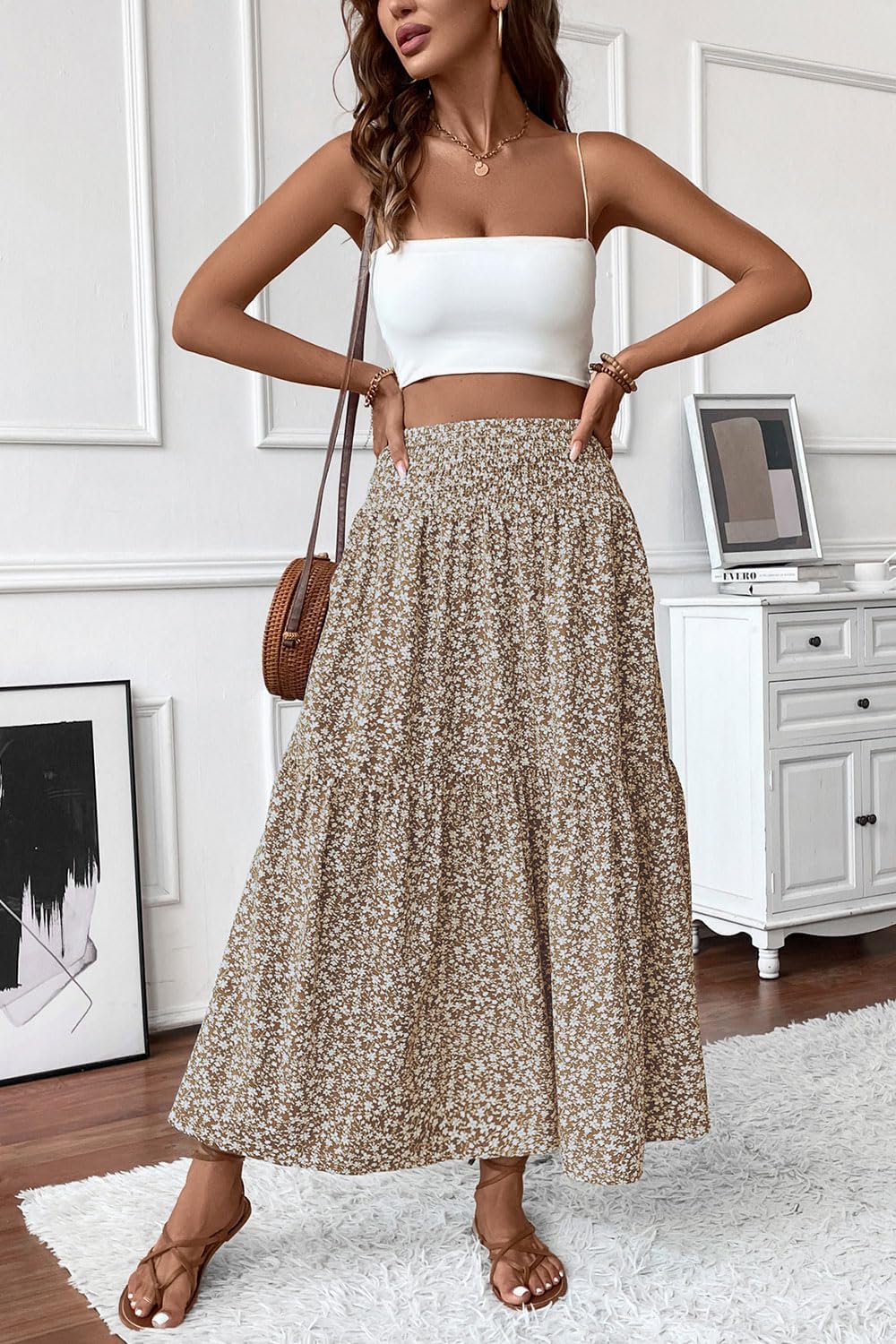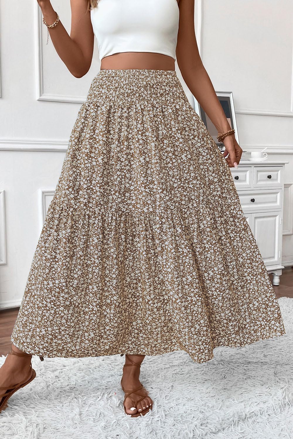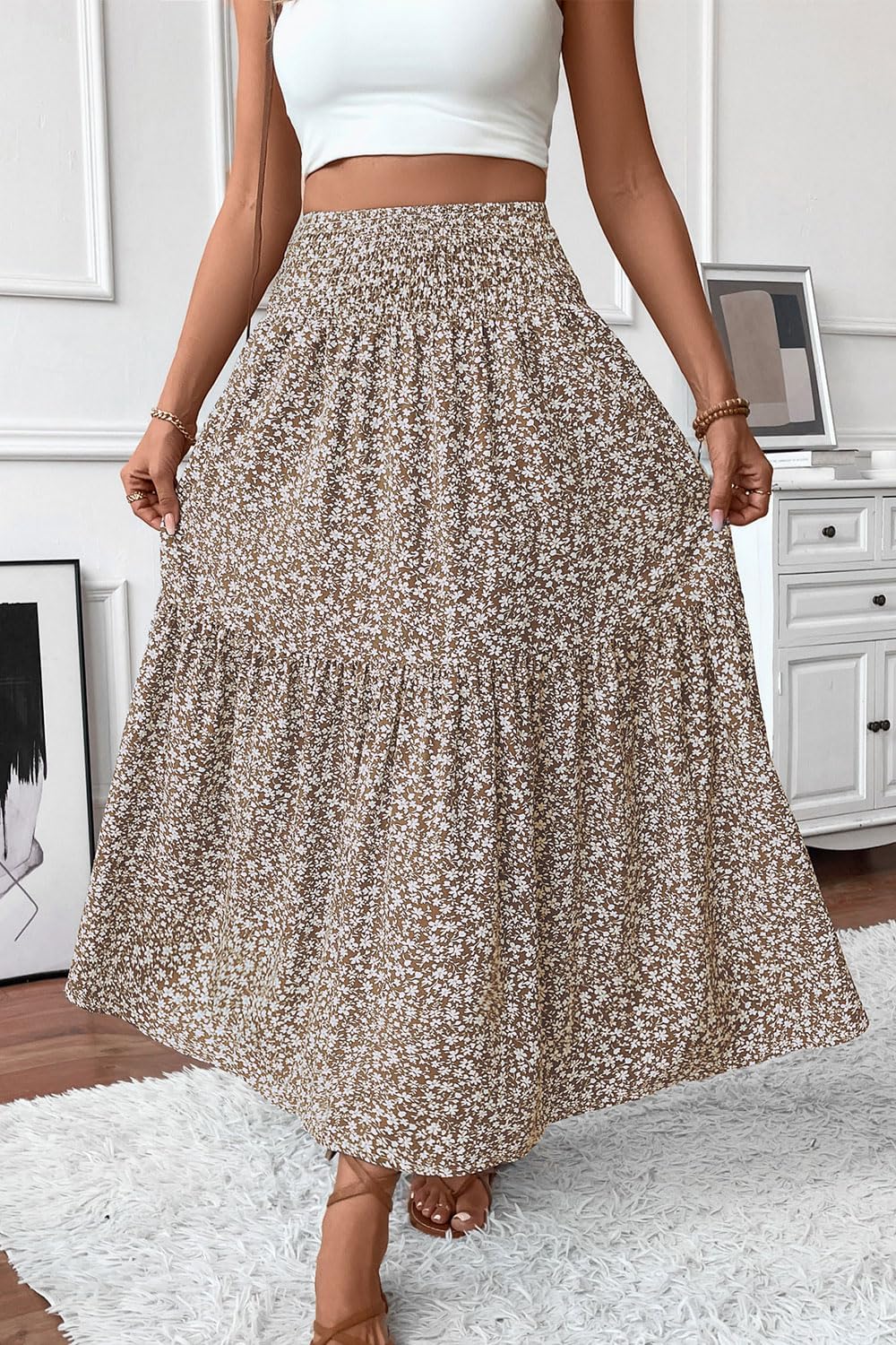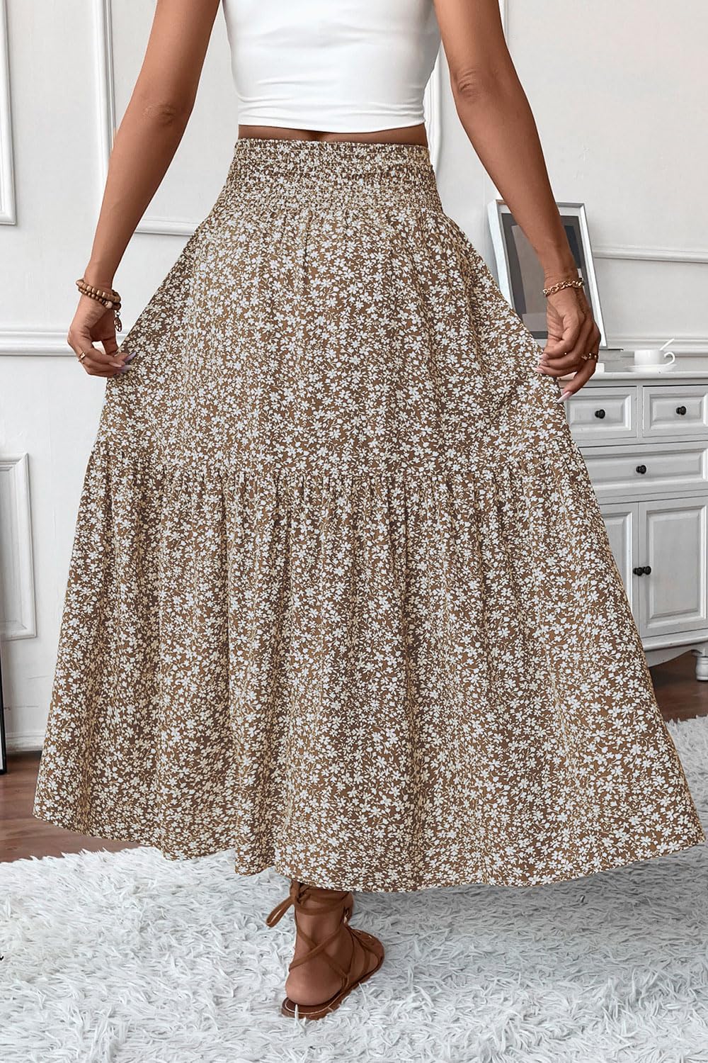 Women’s Floral Long Maxi Skirt Fits True to Size, Smocked High Waisted Fits Any Size Waistline and It is Super Flattering!Long Maxi Skirts for Women. Model Height: 5’8″ , Waist: 24.4″ , Hips: 36.2″, she wears size S, and fit her perfectlyPlease Refer to the Size Chart Before PurchaseS(US4-6): Waist —23.62, Hips — 49.21, Skirt Length — 36.61M(US8-10): Waist —25.2, Hips — 50.79, Skirt Length — 37L(US12-14): Waist —27.56, Hips — 53.15, Skirt Length — 37.4XL(US16-18): Waist —29.92, Hips — 55.51, Skirt Length — 37.8