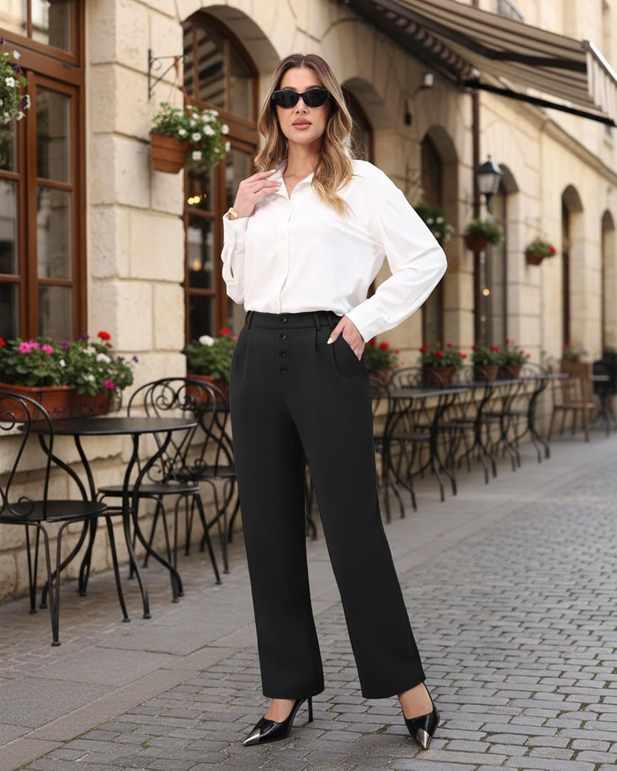 The video showcases the product in use.The video guides you through product setup.The video compares multiple products.The video shows the product being unpacked. Women dress pants with 4 buttons Merchant Video