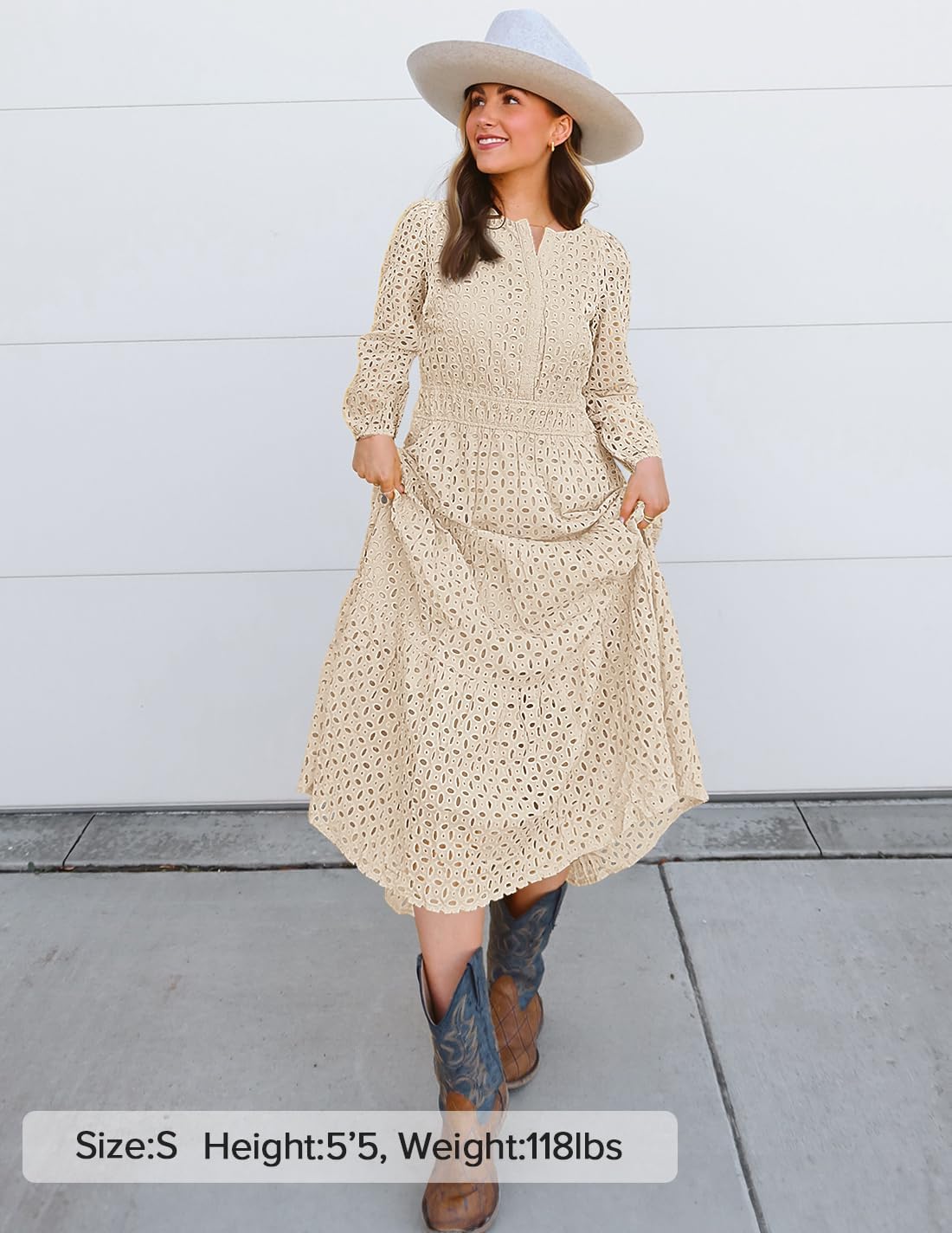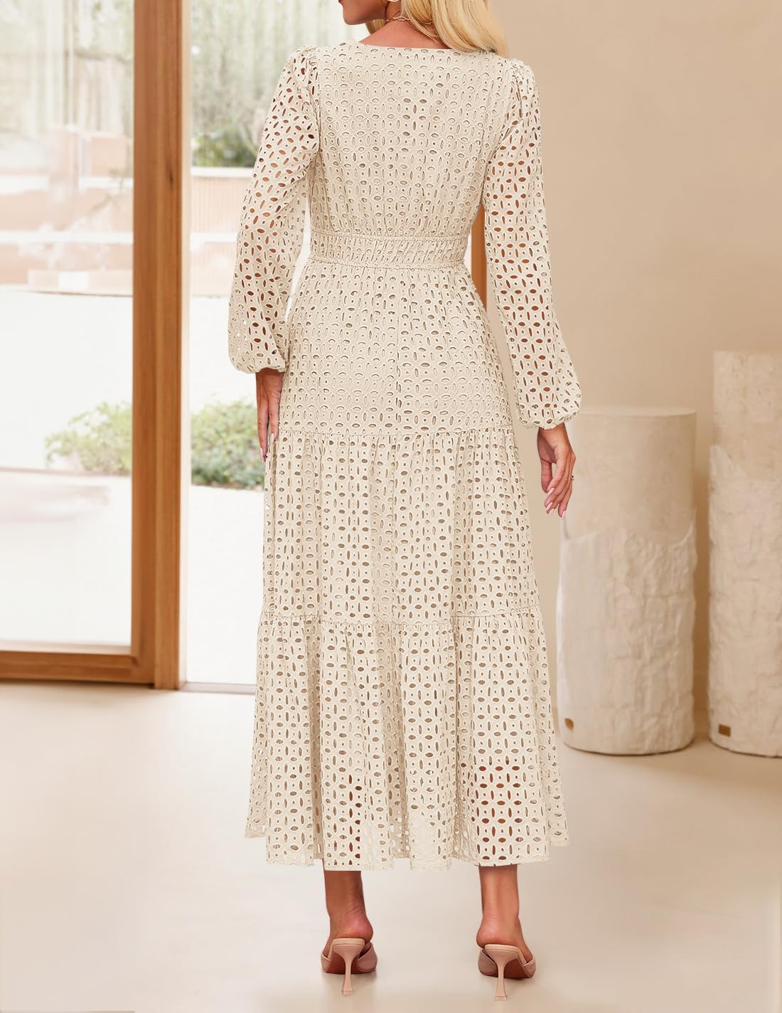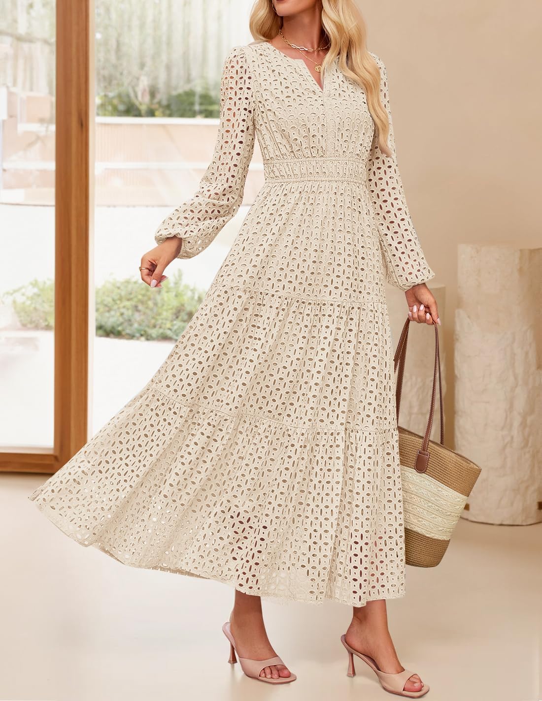 ZESICA Women’s 2026 Spring Long Sleeve Maxi Dress V Neck Hollow Out Eyelet A Line Long Flowy Casual Party Dresses