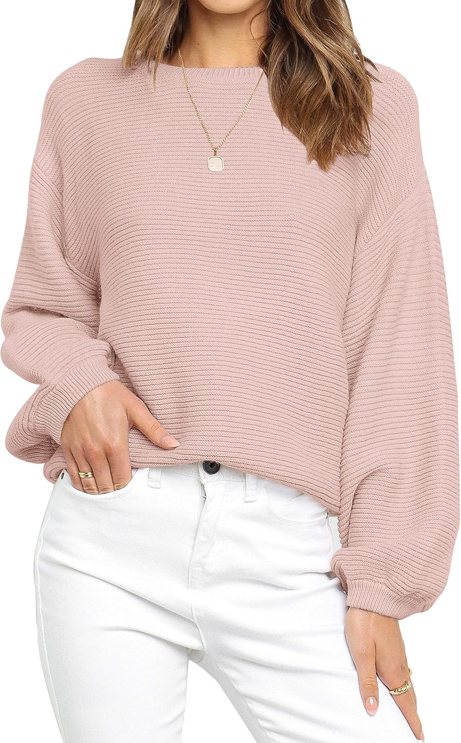 ZESICA Women’s Crew Neck Long Lantern Sleeve Fall 2025 Casual Loose Ribbed Knit Solid Soft Pullover Sweater Tops