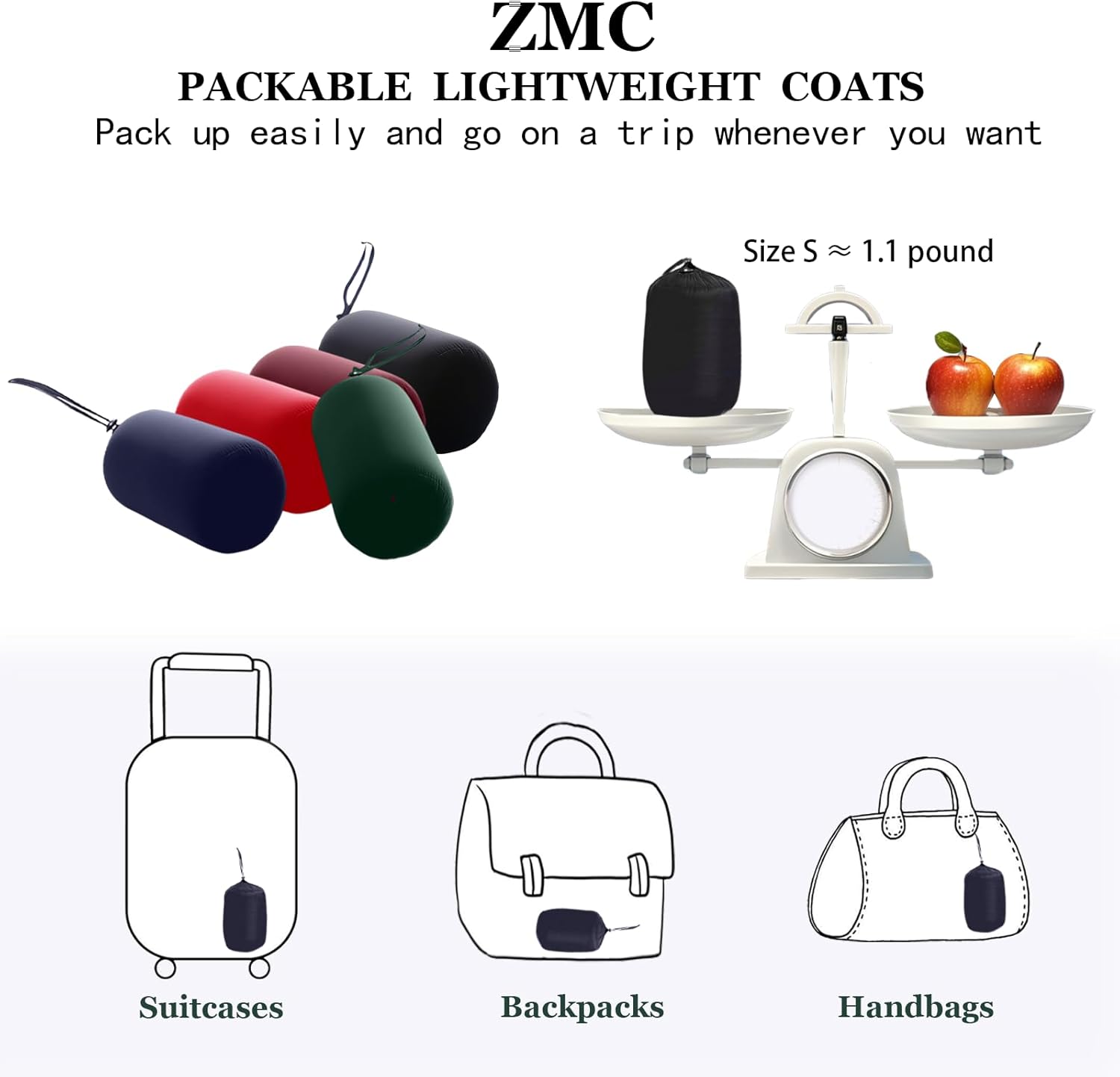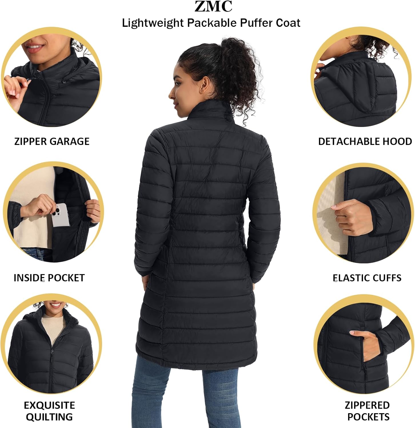 ZMC Packable Women Puffer Coat, Lightweight Water-Resistant Puffer Jacket Detachable Hood Slim-Fit Winter Coat for Women